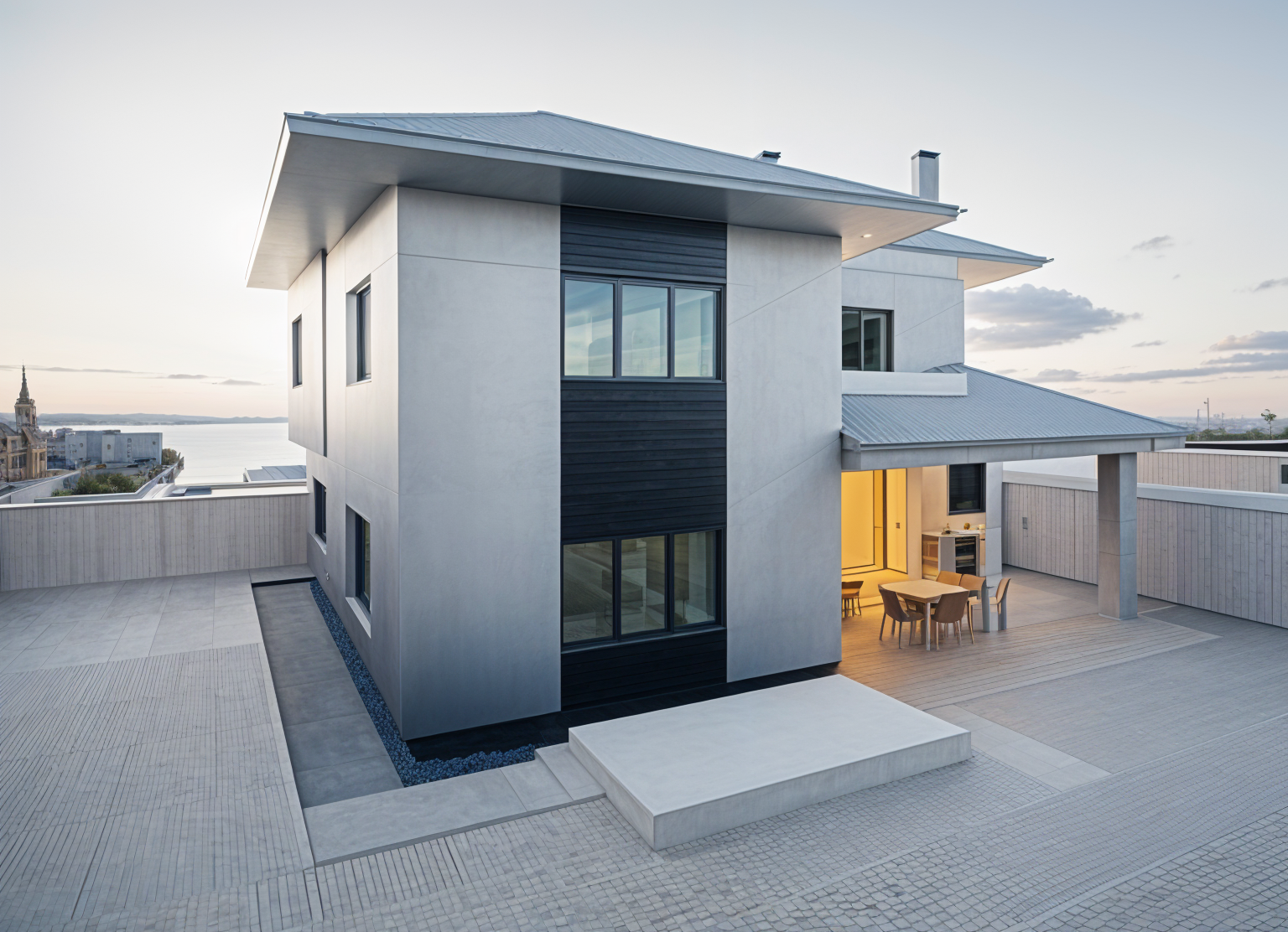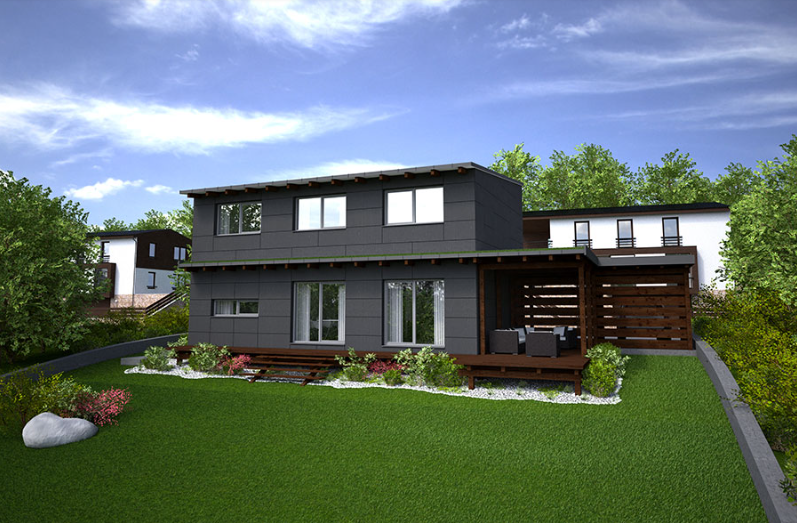 modern exterior shot modern two story house with a sleek gray exterior large windows reflecting the soft glow of the setting sun surround it with lush green grass and vibrant shrubs in shades of red and pink for contrast include a wooden deck with dark brown planks casting subtle shadows on the ground the sky is a clear blue with wispy white clouds creating a serene and peaceful atmosphere in the background add a second house mostly white with dark accents partially obscured by vivid green trees architecture