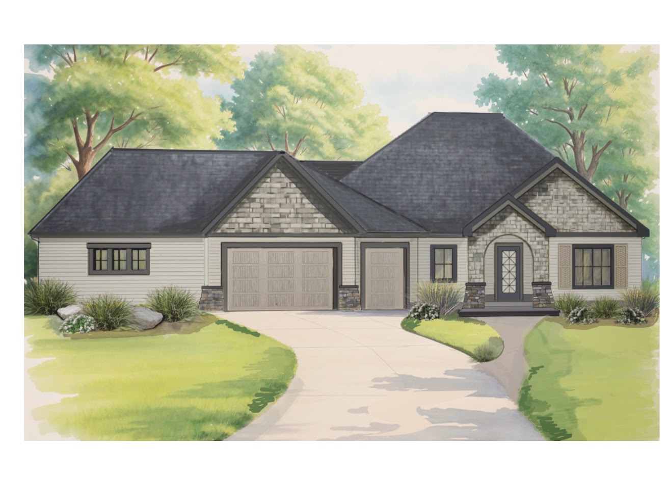 exterior shot please make sure you create the garage as a 45 degree angle from the main part of the house main house color will be sherwin williams amazing grace