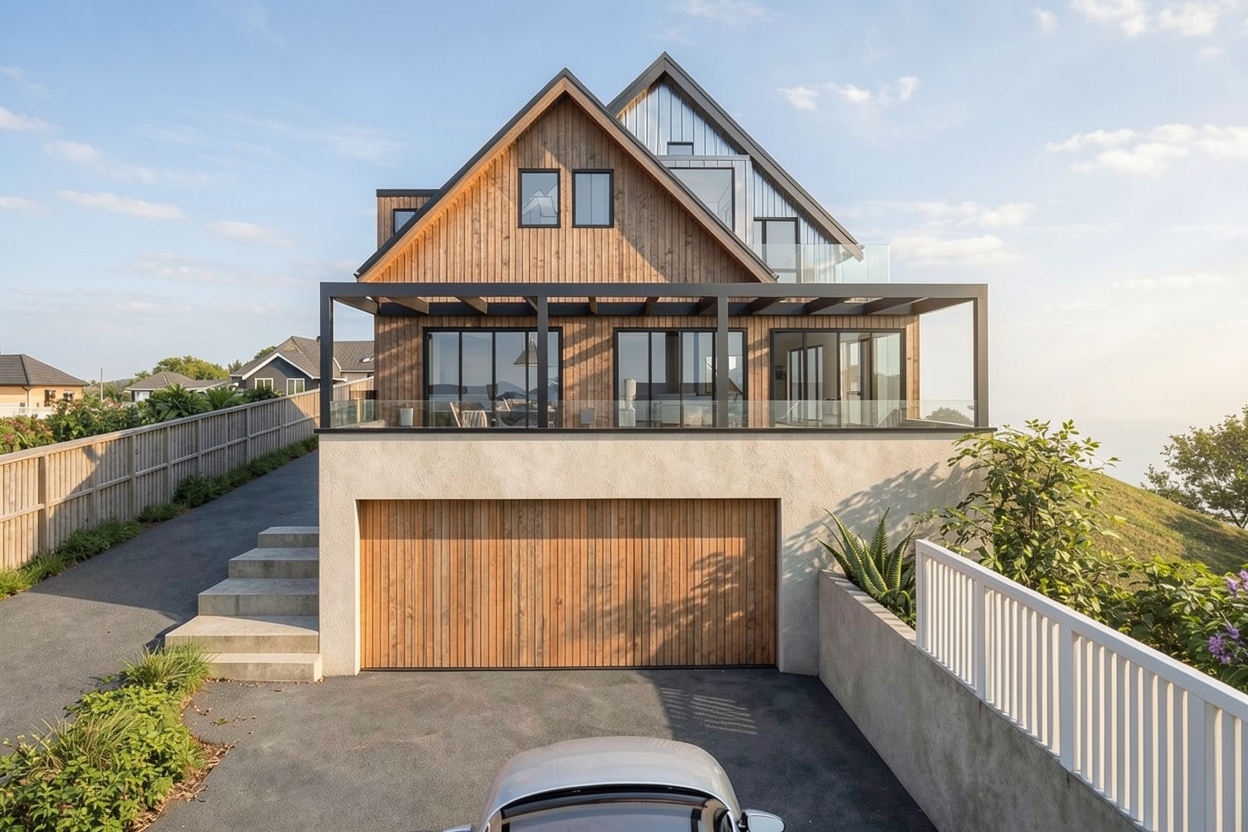 modernist exterior shot simple evergreen landscaping architecture