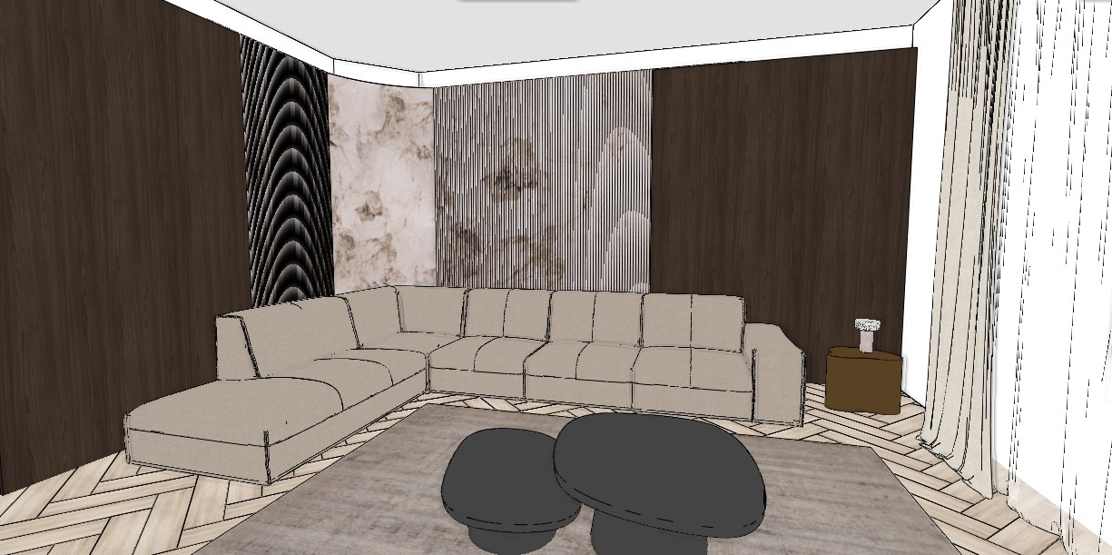 the rendered image should feature clean natural daylight as the dominant light source with soft diffused daylight entering through large openings the lighting should be well balanced avoiding excessive contrast or overexposure while ensuring that details remain clearly visible even in shaded areas the scene should also include 4000 kelvin interior artificial lighting the neutral white tone of this lighting should harmoniously complement the daylight the artificial light must not dominate the scene it should subtly enhance spatial depth and highlight material textures colors must remain accurate and natural with no color shift toward warmer or cooler tones the white balance should be neutral and the render should faithfully represent the original material finishes and shades the overall image should be clean sharp and photorealistic matching the original design as closely as possible in terms of composition proportions and material representation avoid excessive post processing oversaturation or stylization the goal is a realistic and authentic visual presentation there is concealed led lighting running along the top behind the wall panel the wall is covered with a breccia marble flexible wall panel the marble pattern wall panel has a matte finish the surface is flexible the sofa is upholstered in ditre italia atene 003 fabric the small table is made of bronze the lamp on the small table is on