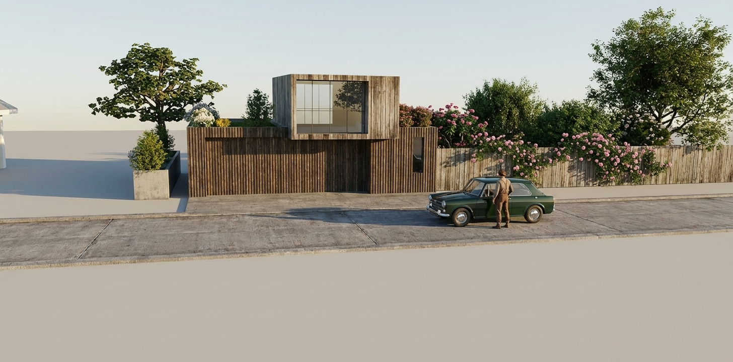 sustainable design exterior shot reconstruction of a building from 30 broadleave forest behind beach in front architecture