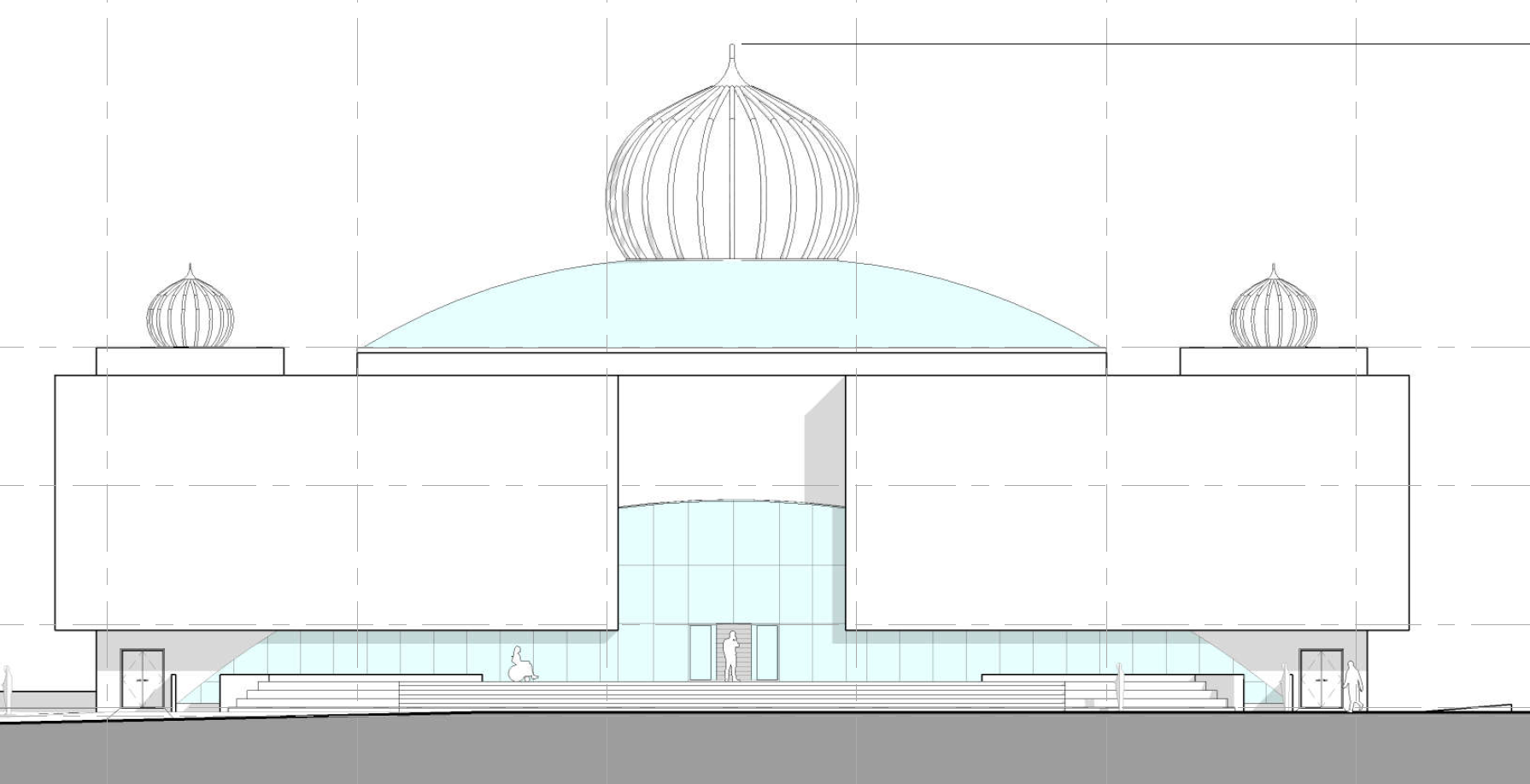 create a beautiful rendering of a sikh gurudwara mosque with a large central dome and two smaller side domes in a modern architectural style symmetrical the main building is white with soft blue tinted glass sections the central dome glows with a gentle gold hue while the side domes are slightly smaller with silver tones the fa ade is minimalist with large flat surfaces made of white stone and sleek glass entrances the surrounding atmosphere is serene set during a clear sunset casting warm pink and orange hues across the sky accentuating the mosque s elegant structure lush seattle setting with mountains in the distance
