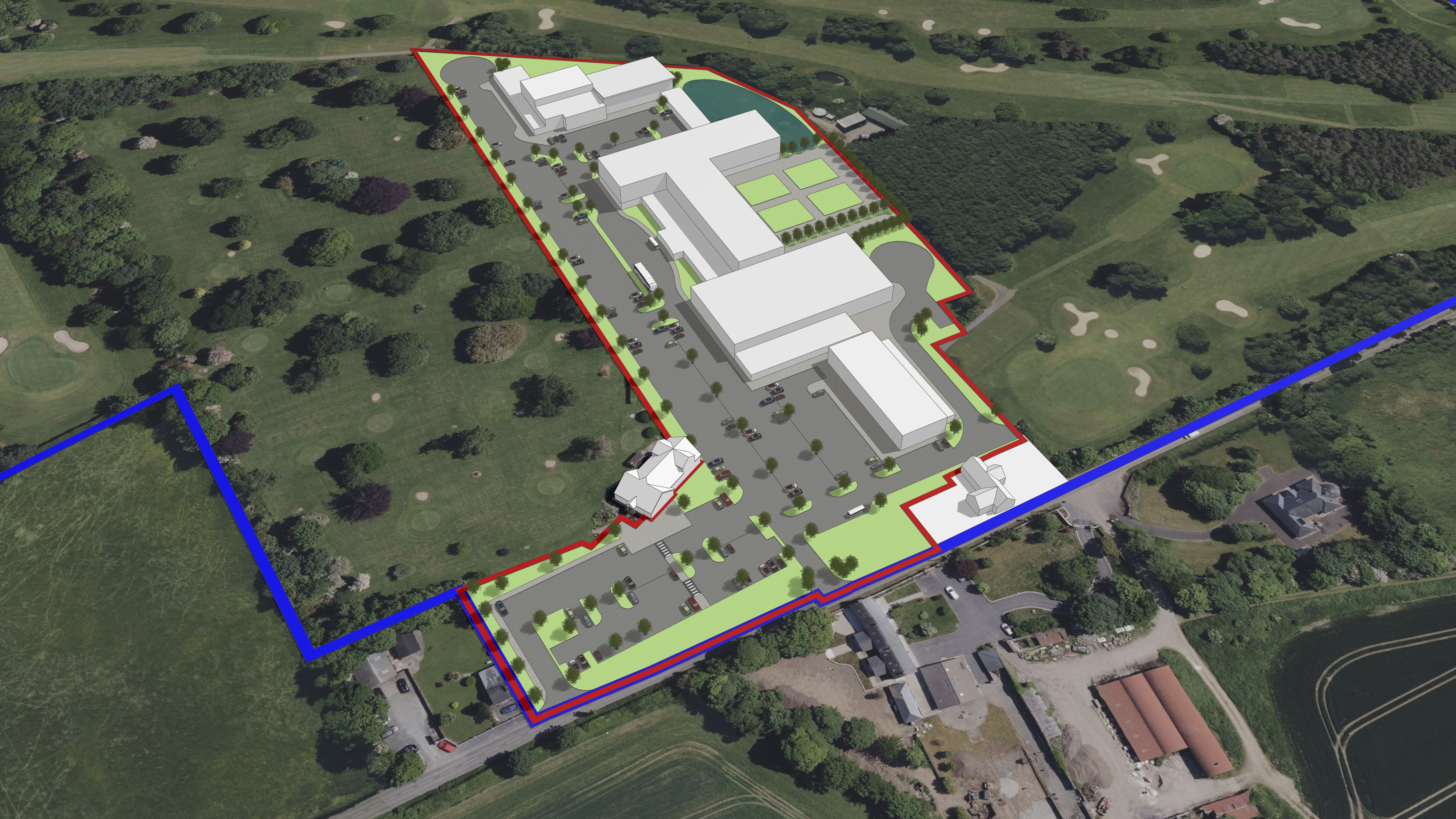 exterior shot render an aerial view of a modern hotel layout in a lush green golf course landscape highlight the main buildings with sleek white exteriors and a contemporary design surrounded by vibrant greenery use a calming combination of light and dark green for the landscaping and incorporate a serene blue for the water features outline pathways and parking areas with a clean gray tone accentuate boundary lines with bold red and blue the atmosphere is peaceful and harmonious with soft natural lighting and a clear sky