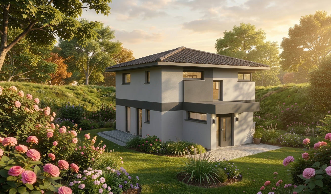 erstelle f r exakt dieses haus eine realistische au enansicht dachziegel anthrazit vord cher blech anthrazit fassade wei fenster und haust re hellgrau das haus soll in einem dezent modernen garten situiert sein behalte alle ma e und farben des hauses exakt bei