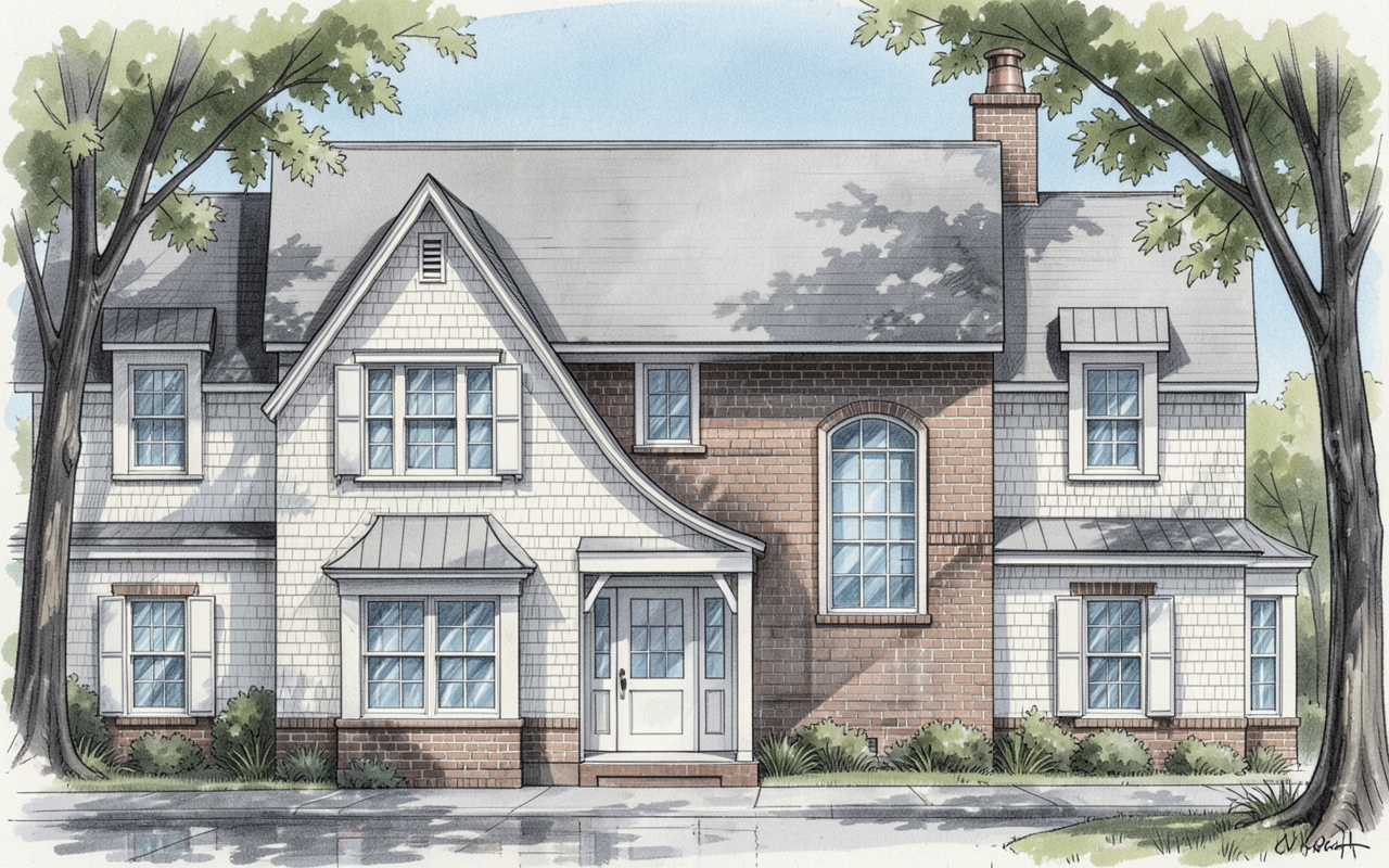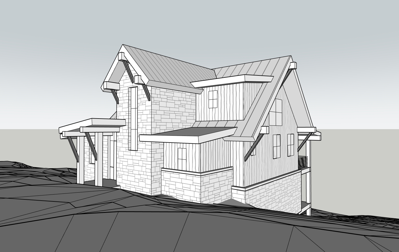 hand render mountain chateau foggy mountain valley below with low hills