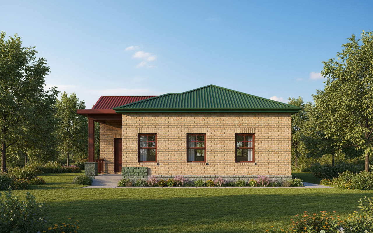a relaxing japandi inspired modern exterior entry courtyard with turfed seating area in a mid century eichler designed suburban home with t g ceilings and set in arizona with a breezeblock wall separating the courtyard from a carport out of view to the right of frame the main living area of the house is visible behind large windows in the mid range background with the backyard visible behind another wall of windows in the far background