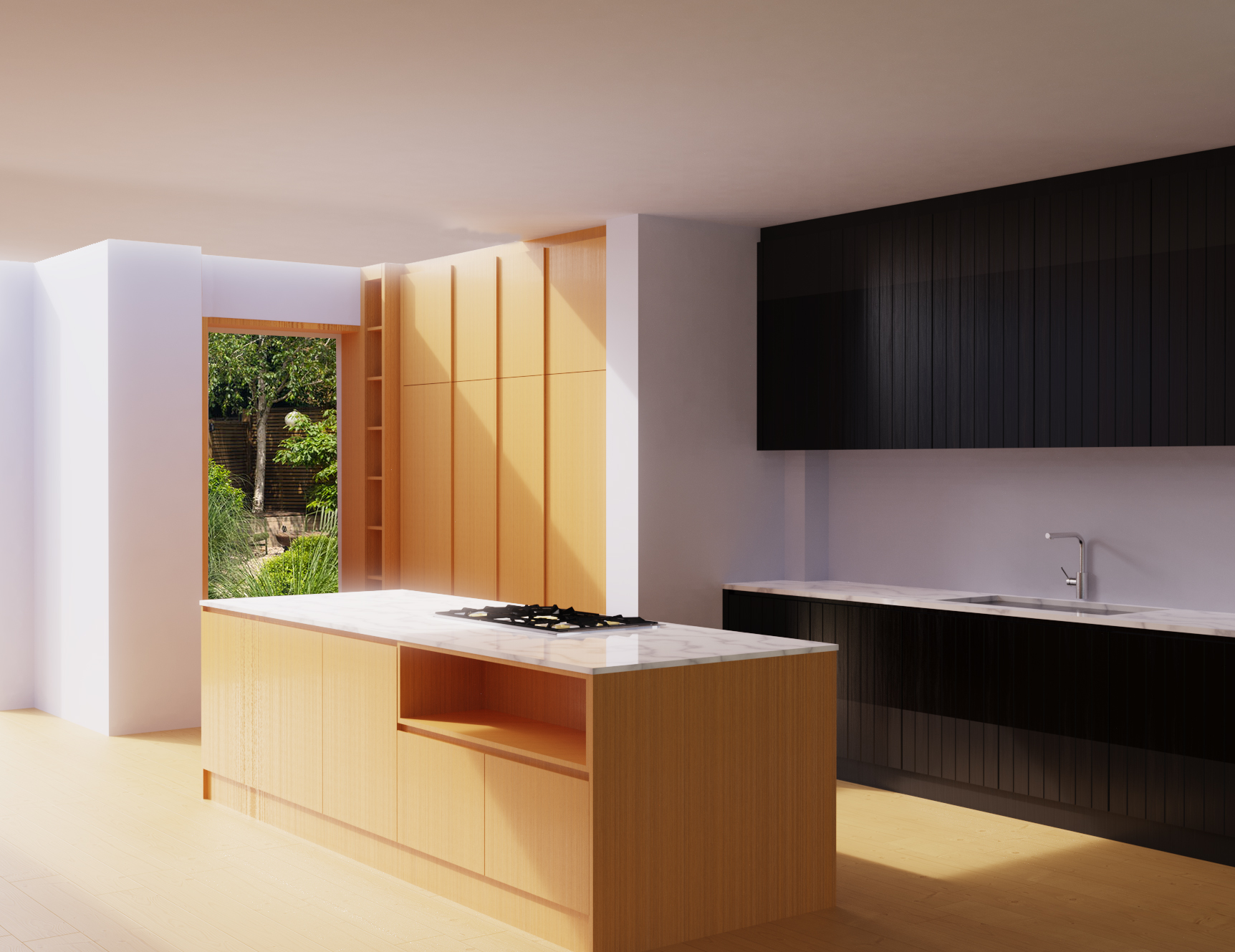 a light white oak kitchen with dark stained timber doors marble counters and full height splashback add some books into the island shelf and some simple modern kitchen ceramics and glassware