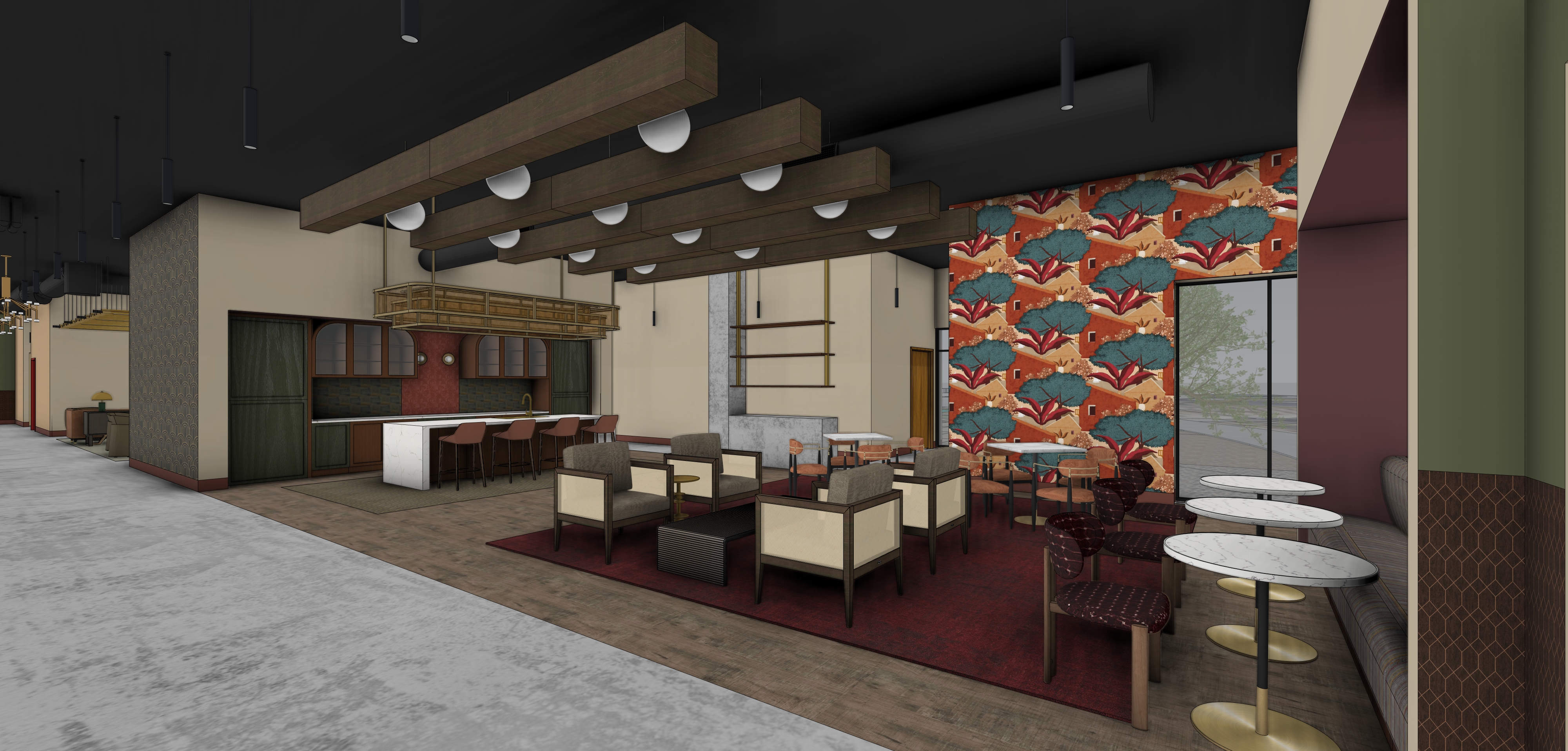 make image photorealistic rendering of an interior collaboration space in refined art deco revival style with contemporary luxury layering preserve all geometry and all finish patterns but make look more realistic preserve all patterns and color on carpet carpet to stay that dark red color for the floor tile adjust the texture to look realistic dont add any extra elements add 10 12 people in the space add decor in shelving units in back add lighting to light fixtures more of a moody vibe but feels high end don t add extra furniture or shelves the wall with the dark wall paper on the left is made of wood stained black wall over the casework is the same cream color as the other walls no vases on top of light fixture make the beam baffles a darker wood add some decor to the coffee table fill casework with glasses and bottles