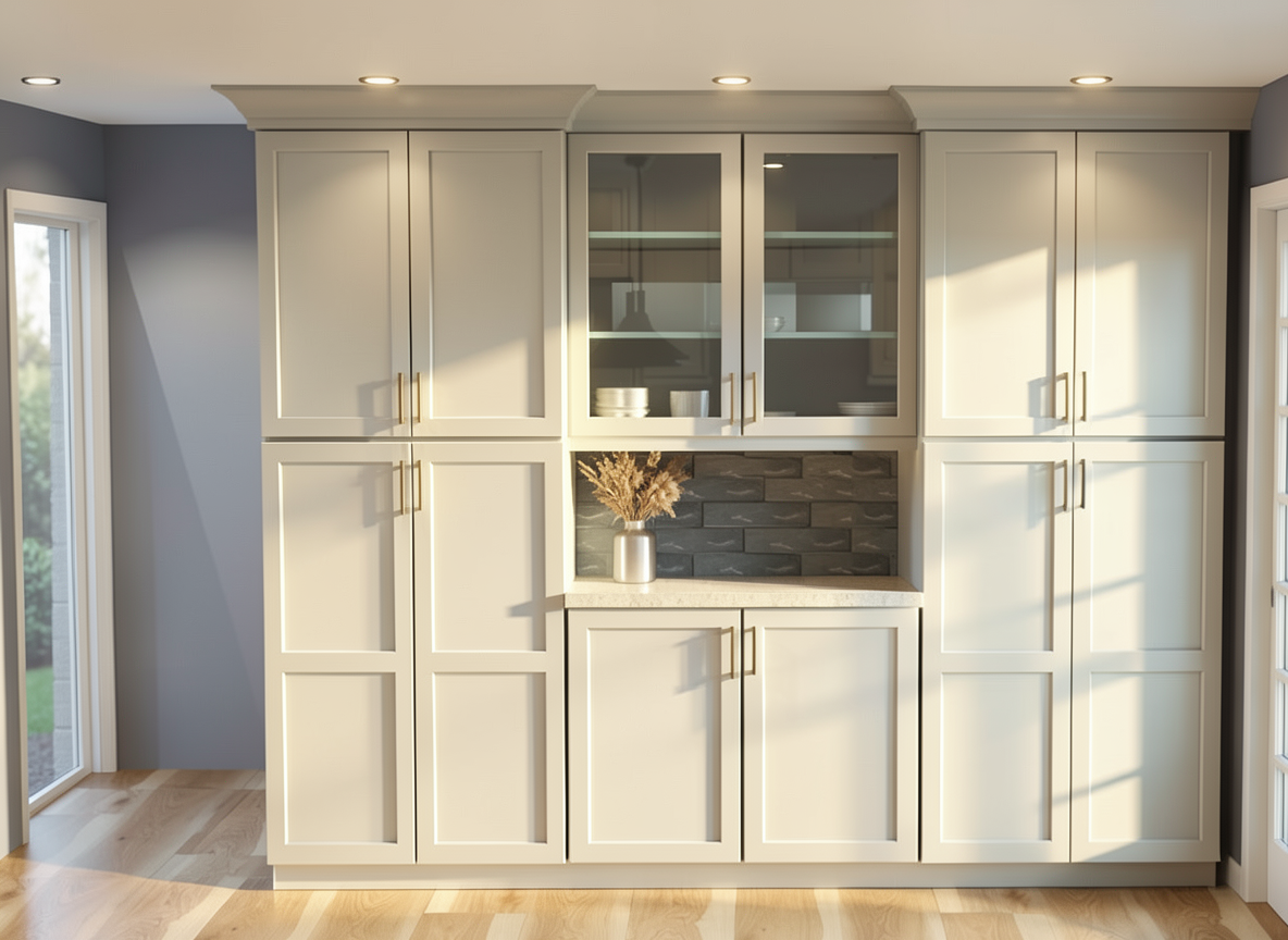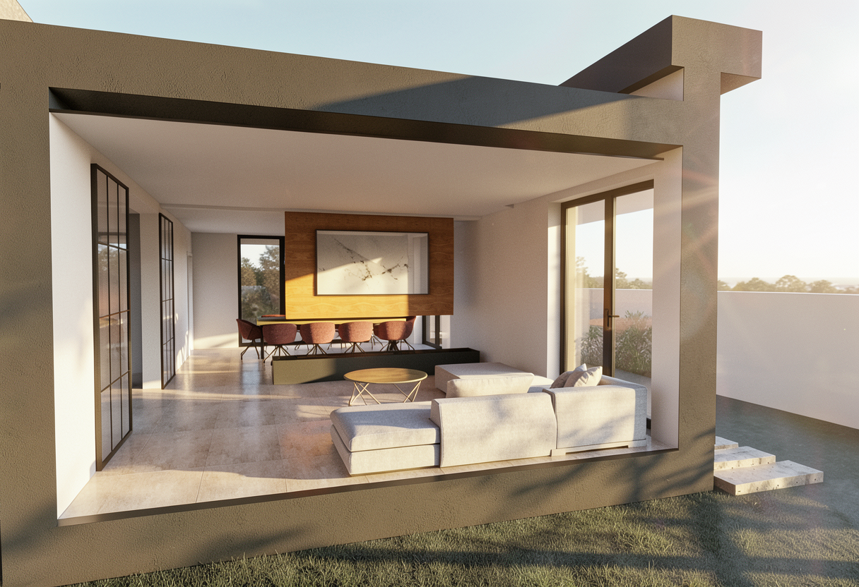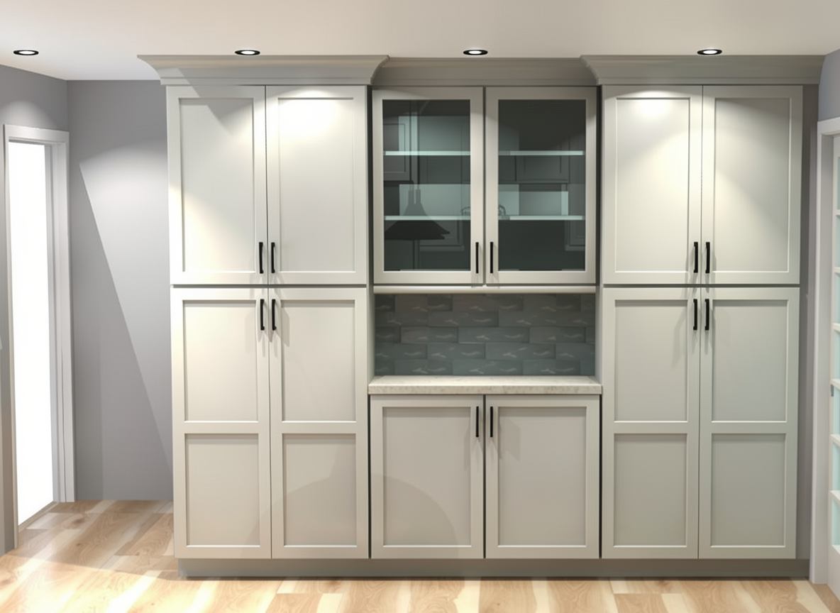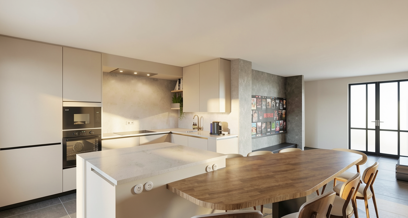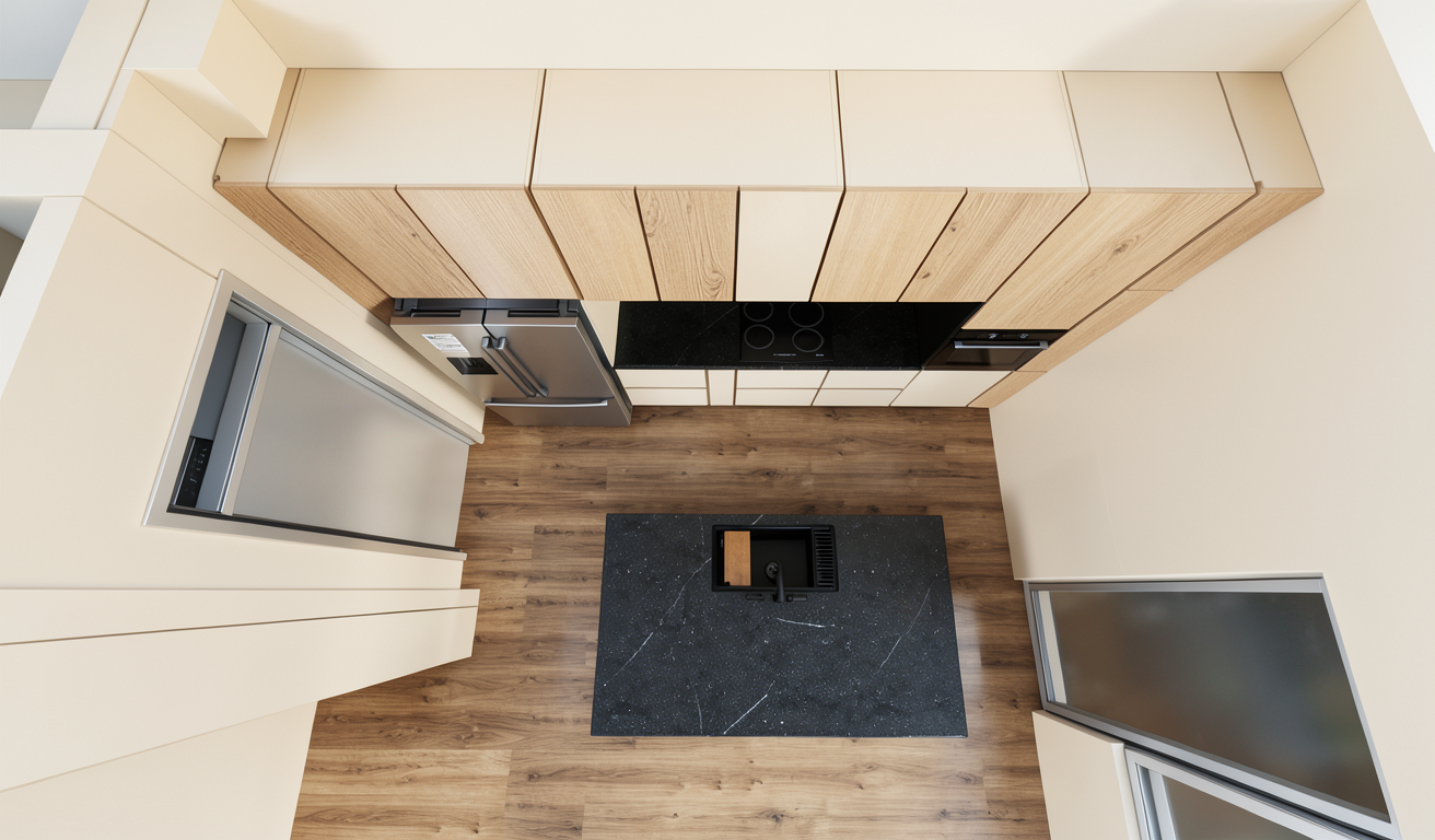 turn this top view kitchen sketch into a realistic modern render while keeping the exact same top view camera angle kitchen layout island position cabinet arrangement appliance placement proportions and overall design do not redesign anything remove all dimensions measurement text arrows guide lines and technical annotation lines completely so the final result looks like a clean realistic render not a technical drawing keep the materials exactly like the sketch side tall cabinets in natural oak wood veneer wood accent areas in natural oak veneer main central cabinets in soft warm cr me matte finish island front panels in soft warm cr me matte finish island countertop and waterfall sides in black stone back countertop backsplash area in dark black stone black sink and black faucet on the island stainless steel refrigerator built in black appliances warm natural wood floor the oak wood must stay clearly visible on the side tall units and wood accent cabinet areas do not turn all cabinetry white the cr me parts should stay only where shown in the sketch while the oak stays oak make it look like a clean premium kitchen render with realistic materials realistic shadows and sharp top view presentation important do not make all cabinets white keep the exact material zoning from the sketch oak wood where wood is shown cr me where cr me is shown negative prompt restriction no all white kitchen no replacing wood with white panels no measurement text no dimension lines no arrows no technical annotations no redesign no layout change no camera change