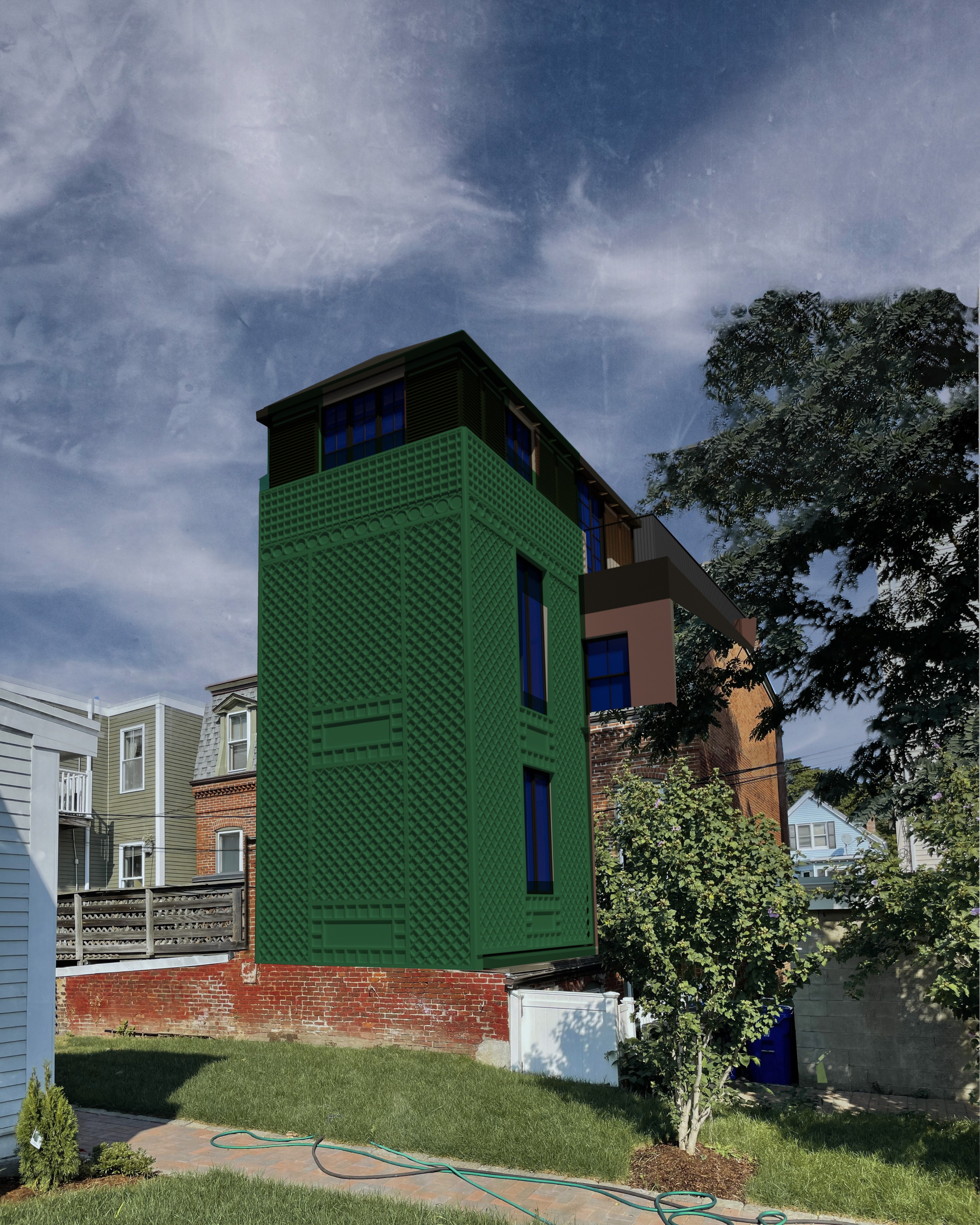 blue represents glass make the reflections and transparency realistic green lattice is painted wood upper louvers should be deep rich wood roof is standing seam copper repair and repoint existing brick wall do not change any surrounding geometry or materials