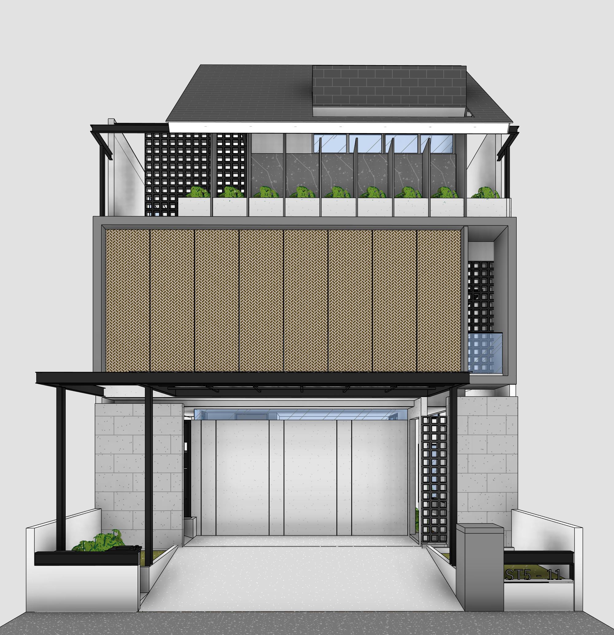 exterior shot super realistic exterior render of a modern tropical house based on the provided architectural model use warm late afternoon lighting golden hour with soft long shadows apply premium materials dark matte concrete panels textured natural wood vertical slats brushed black metal frames clear reflective glass and lush tropical plants enhance fa ade depth with strong ambient occlusion accurate gi and sharp material micro details use realistic wood grain and natural color variation sky should be soft blue with faint clouds environment asphalt street grey stone paving blocks trimmed green landscape modern neighborhood context slightly blurred render style high end architectural photography clean composition no people no distortion overall mood calm luxurious warm modern tropical architecture