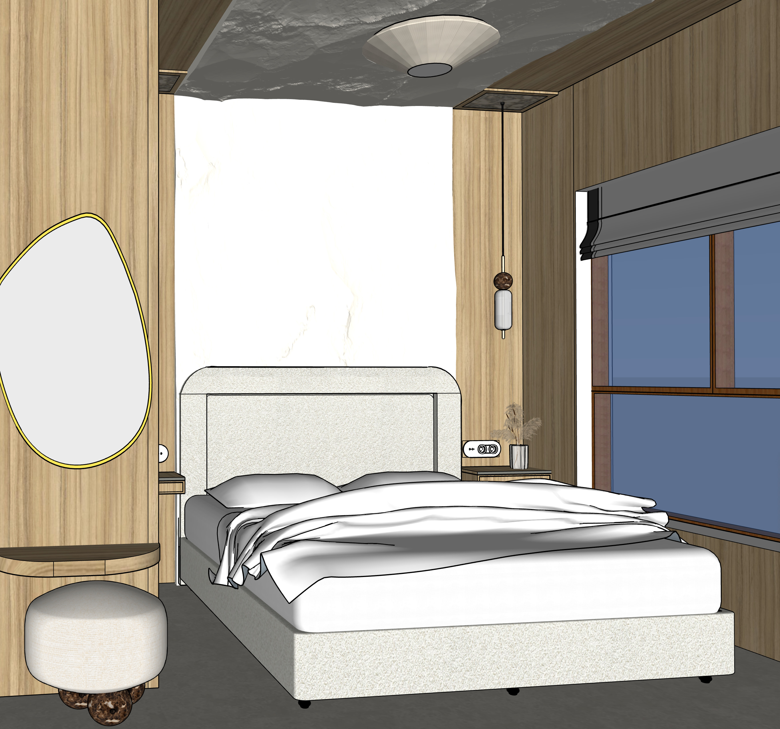 make pendant lights glow warm light and make mirror yellow frame glow natural light wall and celling is a slate travertine texture change celling lamp into a fabric one with soft light