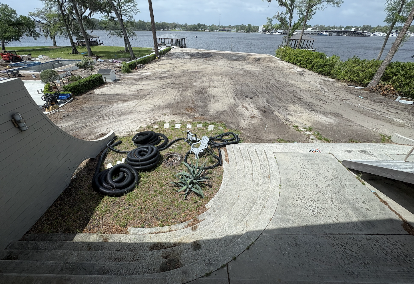 in the area of this back yard where the dirt is located can you show me some terraced options for landscaping ideas i want the terraces to get lower as you get closer to the river