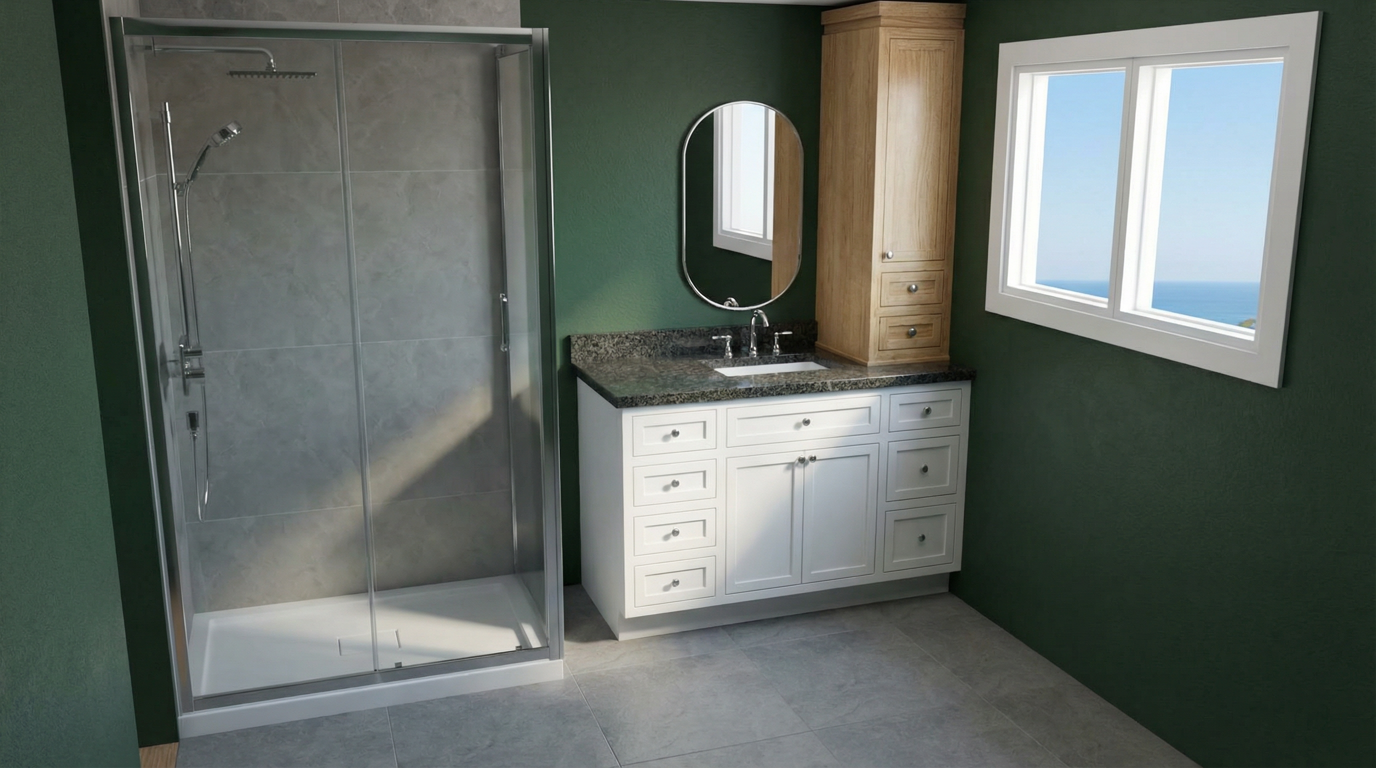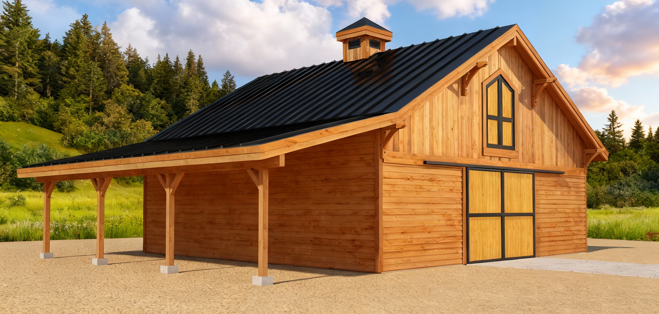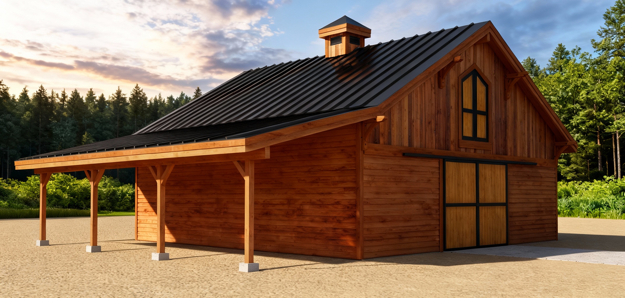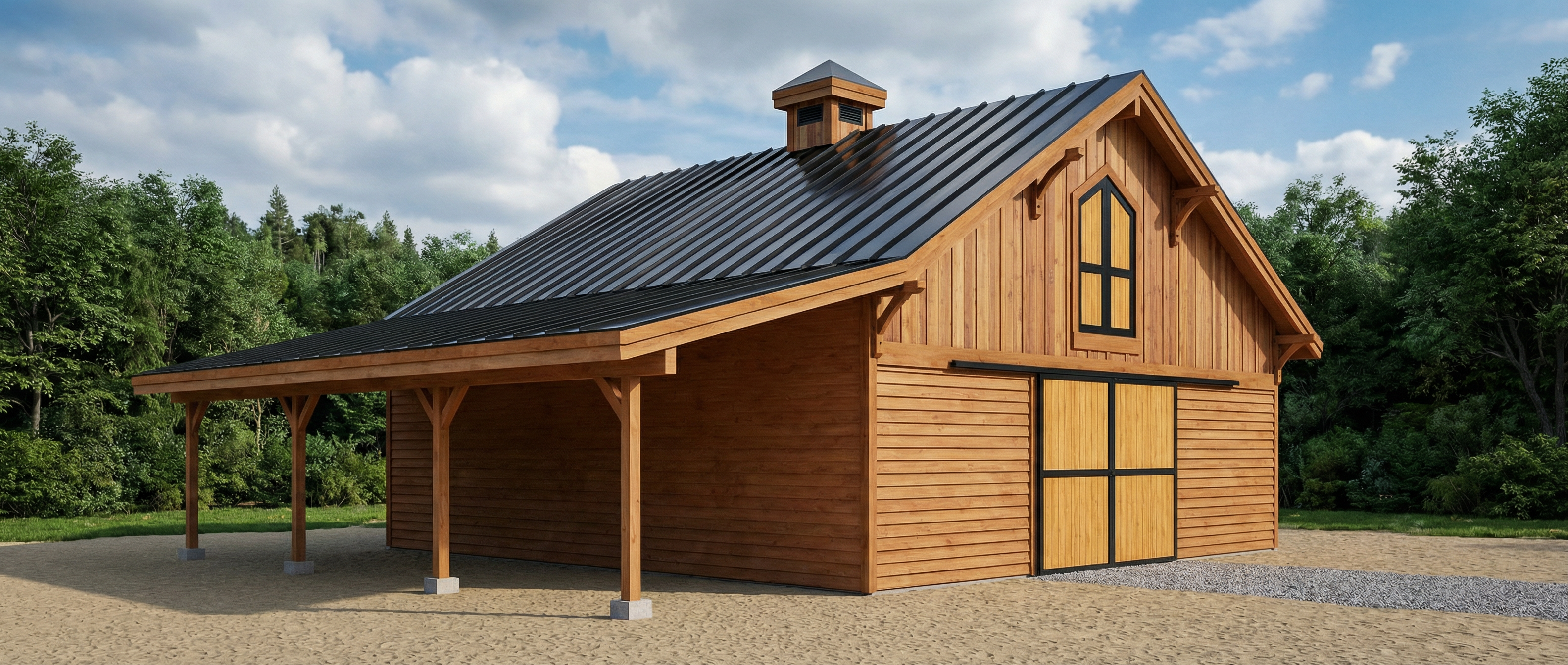 timber clad architectural exterior rendered in cinematic bright natural daylight lighting beautiful clouds in the sky natural light cedar wood siding with black trim wood hayloft door with dark trim wood barn doors with black trim black metal standing seam roof heavy forest area background lush green and dynamic vegetation landscape natural wood textures high fidelity photorealistic visualization crisp shadow falloff refined fa ade geometry richly detailed grain patterns less vibrancy and more detail on the wood soft atmospheric depth calm minimal landscaping premium architectural photography mood ultra clean composition and materials reduce vibrancy