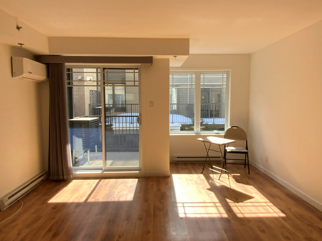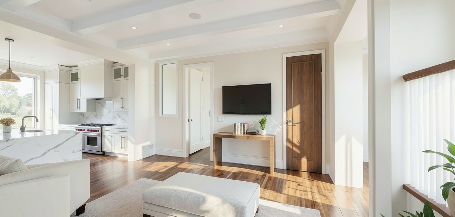 using this photo create a photorealistic 3d model of the living room with a simple yet eclectic layout the side tables coffee table end table should be antique style and made of natural oak the ikea ringklocka rug in cream and yellow should be placed in the center of the room a gray leather upholstered rocking chair should be in the corner near the windows three portraits made with simple white lines on a black background should decorate the walls