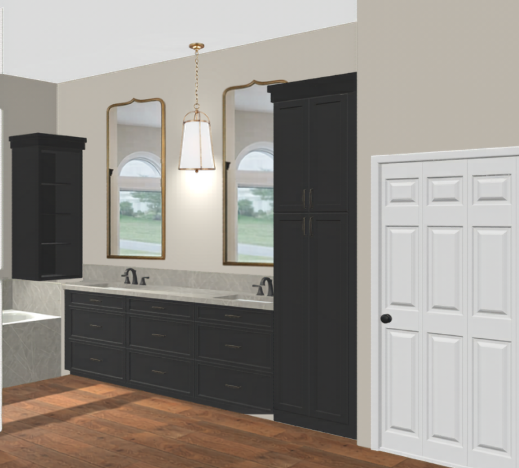 create a photorealistic rendering of this bathroom adding taj mahal countertops and bathroom decor in the bookcase and runner on the floor please keep the vanity cabinets black