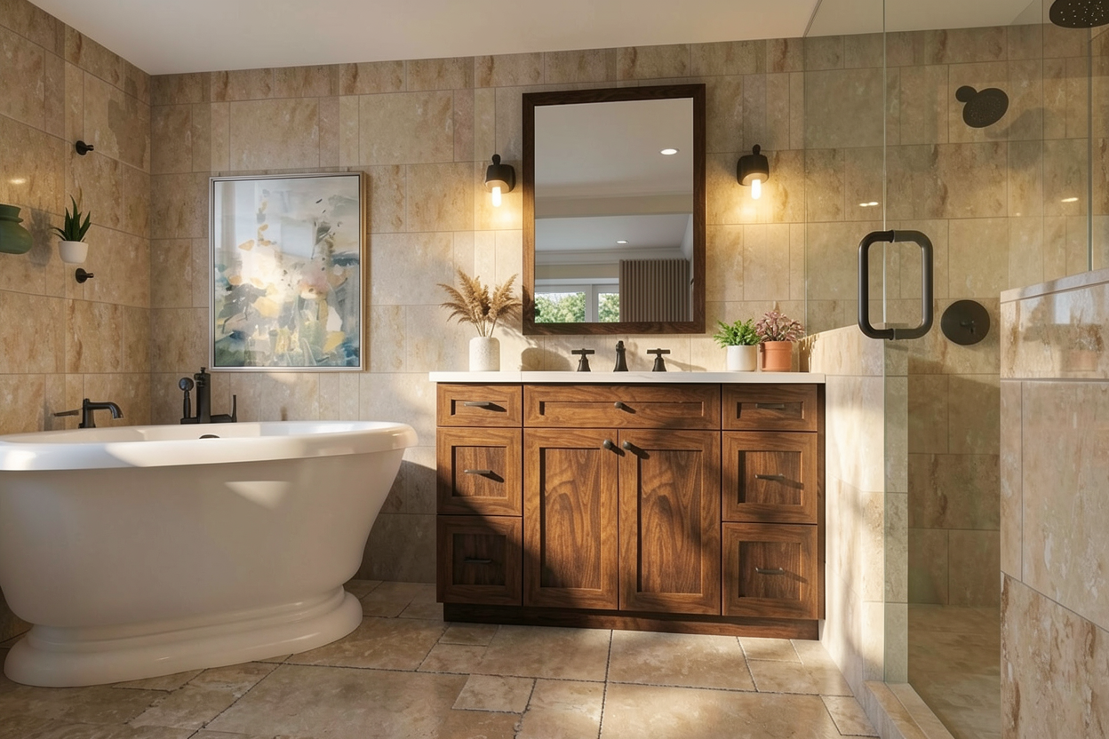 a large elegant white house with dark grey roofing shingles surrounded by lush greenery and tall trees highlight the natural sunlight casting soft warm shadows vibrant green grass lawn rustic wooden window frames rich red brown front door bright blue sky in the background create a serene picturesque atmosphere