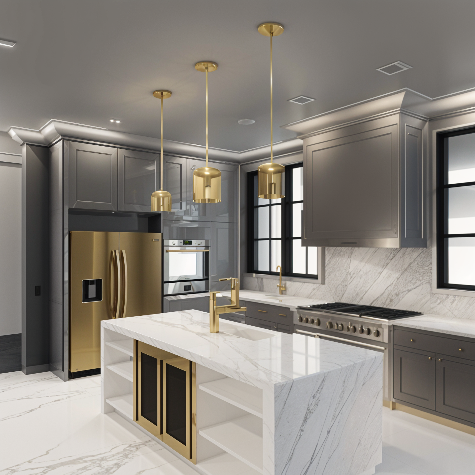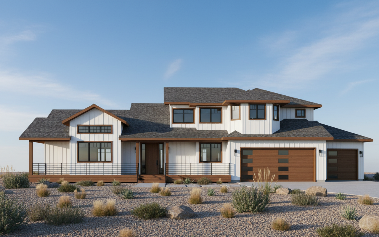 modern front elevation with 45 degrees to a triple garage upper floor comes forward over garage roof slate gray walls white with dark wood trim windows large with black frames deck wrap around door dark oak garage matching walls landscape xeroscape sky clear blue with soft morning sunlight overall atmosphere inviting cozy harmonious blend of modern architecture and nature