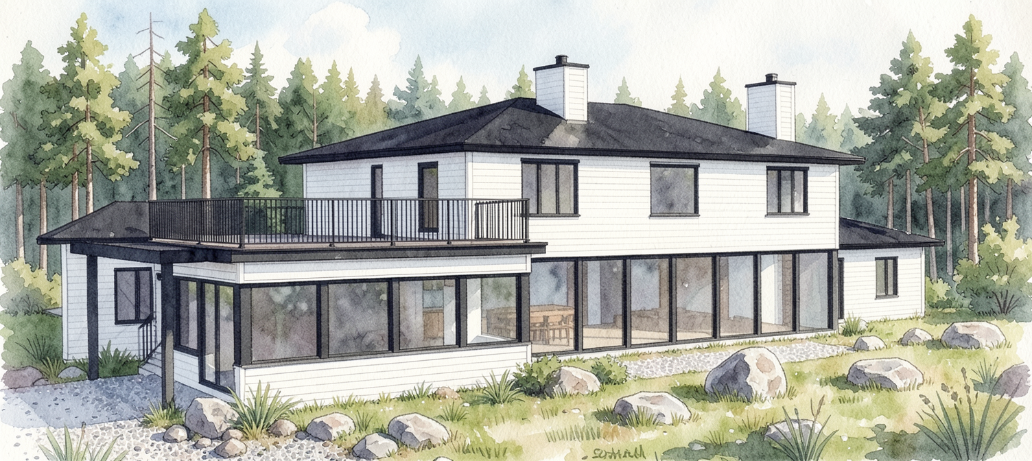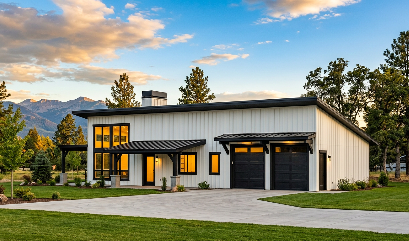 clean modern barndominium architectural exterior home rendered in cinematic vibrant golden hour lighting with blue skies and vibrant clouds barndominium in a lush beautiful mountain setting with green grass and dense trees surrounding the property warm glow and reflections off of the windows select grade vertical white hardie siding green manicured landscape around structure with gardens and patches of grass black standing seam metal roof high fidelity photorealistic visualization crisp shadow falloff refined facade geometry soft atmospheric depth premium architectural photography mood ultra clean composition and materials photorealistic render black trim around the windows and doors prominent trees scattered around the property black window trim and posts concrete driveway leading to the garage doors