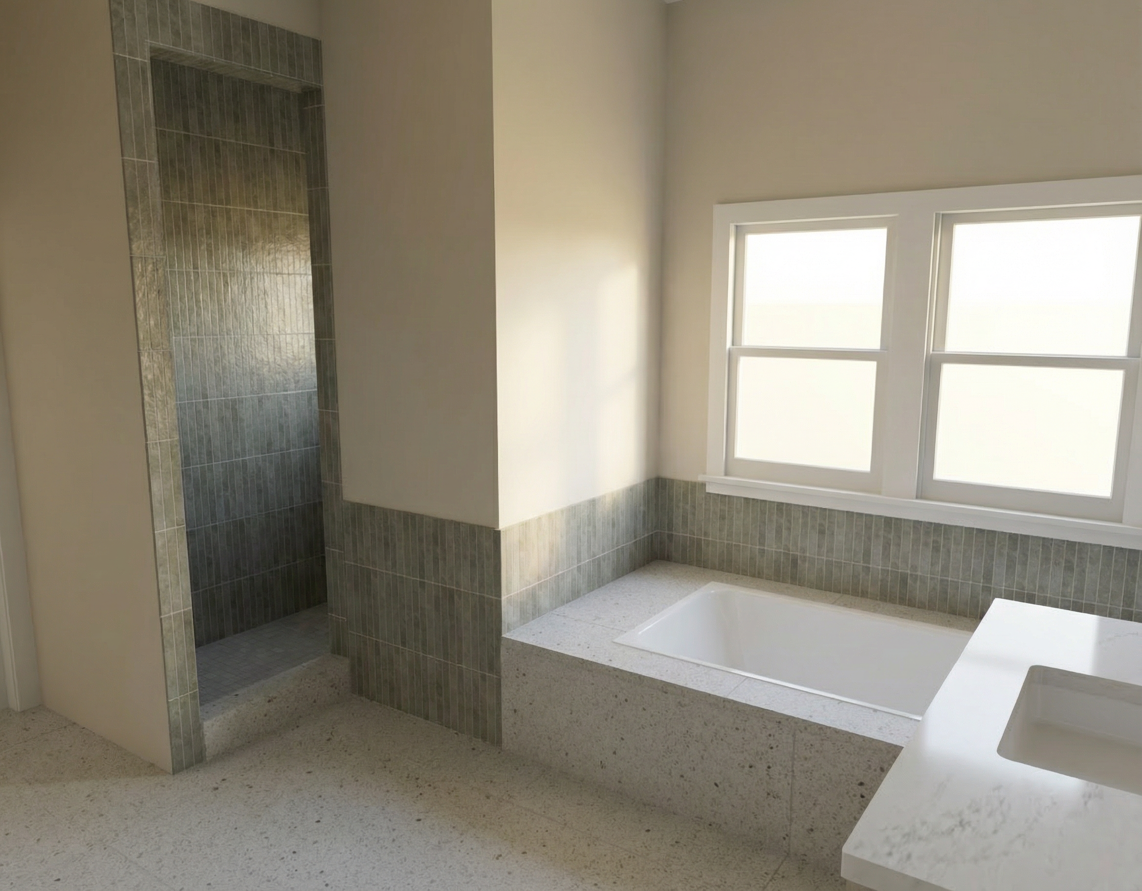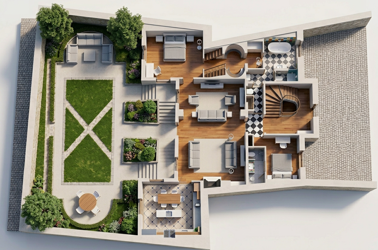 create a photo realistic rendering of a modern kitchen use deep walnut wood tones for the island giving a rich luxurious feel the perimeter cabinets are a black stain on wood graining must be visible all perimeter cabinets must be seen the countertops are adorned with a marble pattern in shades of brown and beige adding elegance the range hood is a brushed copper incorporate matte brass handles and light fixtures for a sleek contrast the wall sconces should be in brushed brass for warmth and sophistication the flooring is a medium polished hardwood enhancing the overall depth the atmosphere is cozy yet modern with warm ambient lighting creating an inviting and stylish space make the render the same angle as taken make the space lighter all cabinet pulls and knobs will be brass the faucet will be matte black all perimeter cabinets must be seen add in some natural lighting from the right overall lighting warm balanced and slightly brighter than current sconces must cast visible downward light beams onto backsplash add soft under cabinet lighting glow do not overexpose or wash out materials maintain warm high end interior mood both side openings must lead into interior rooms not blank or exterior make them squared off and no windows in these areas there will be no lights under the toe kicks use the same angle as the image shown and provided all sconces on both sides of the hood should be lit downward use warm cohesive tones wood taupe soft browns no bright white or harsh contrast slightly dimmer lighting than kitchen keep the same angle as the image provided