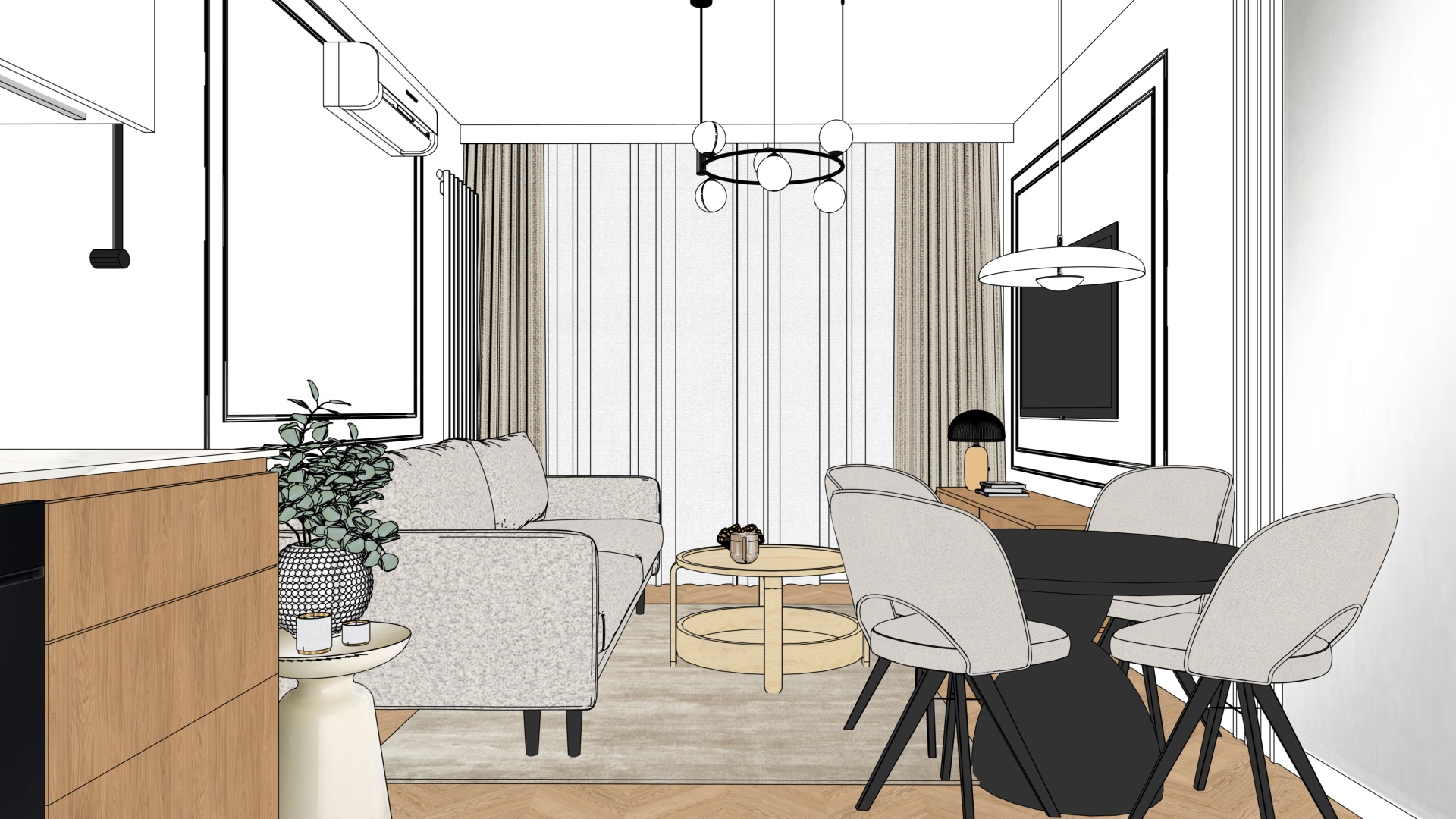 fotorealistyczna fotografia wn trza klasy premium projekt uk ad meble i materia y bez adnych zmian wzgl dem obrazu wej ciowego naturalne wiat o dzienne perfekcyjna ekspozycja naturalny balans bieli bardzo realistyczne materia y i detali zero zmian zero okien lampa nad sto em okr g ym ma kolor bia y krzes a lekko szare bez oblam wki meble drewniane s w kolorze egger vicenza sofa i krzes a w kolorze delikatnej szaro ci zas ony s w kolorze jasno be owym wok tv jest bia a sztukateria za sof jest bia a sztukateria o wietlenie w lampach w czone yrandol w salonie jest czarny z bia ymi kulami po lewej stronie na cianie jest czarny kinkiet z delikatnym o wietleniem po prawej stronie za krzes ami jest lustro do pod ogi zaznaczone na zdj ciu wyj ciowym na szaro