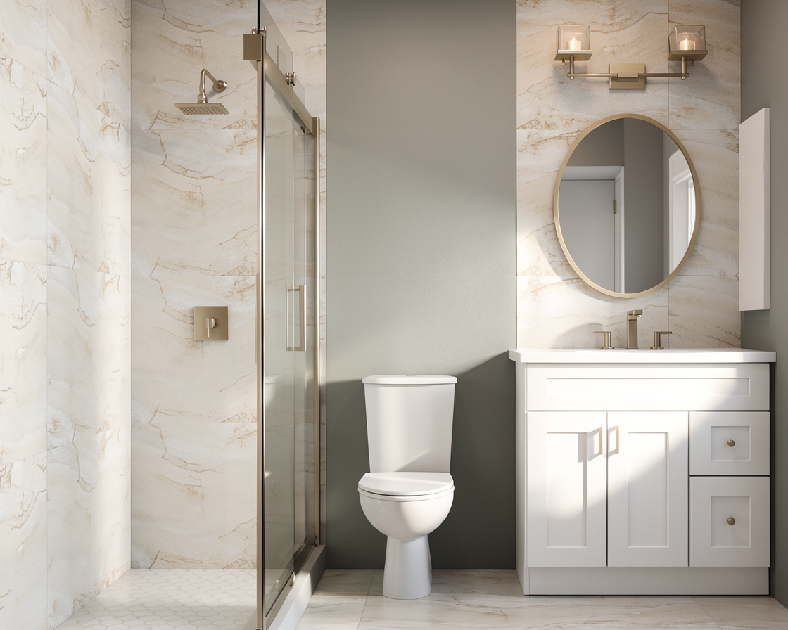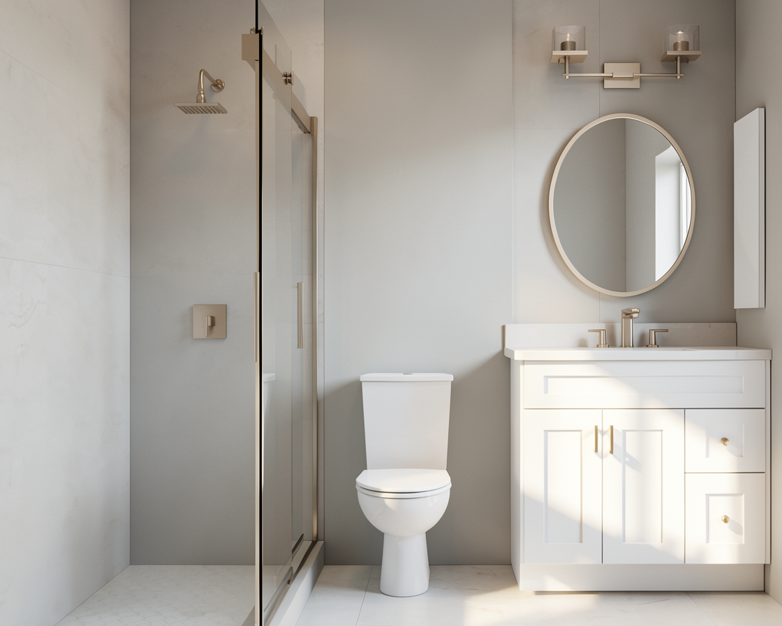 do not change layout white cabinets no cabinet above the toilet no heater on the wall