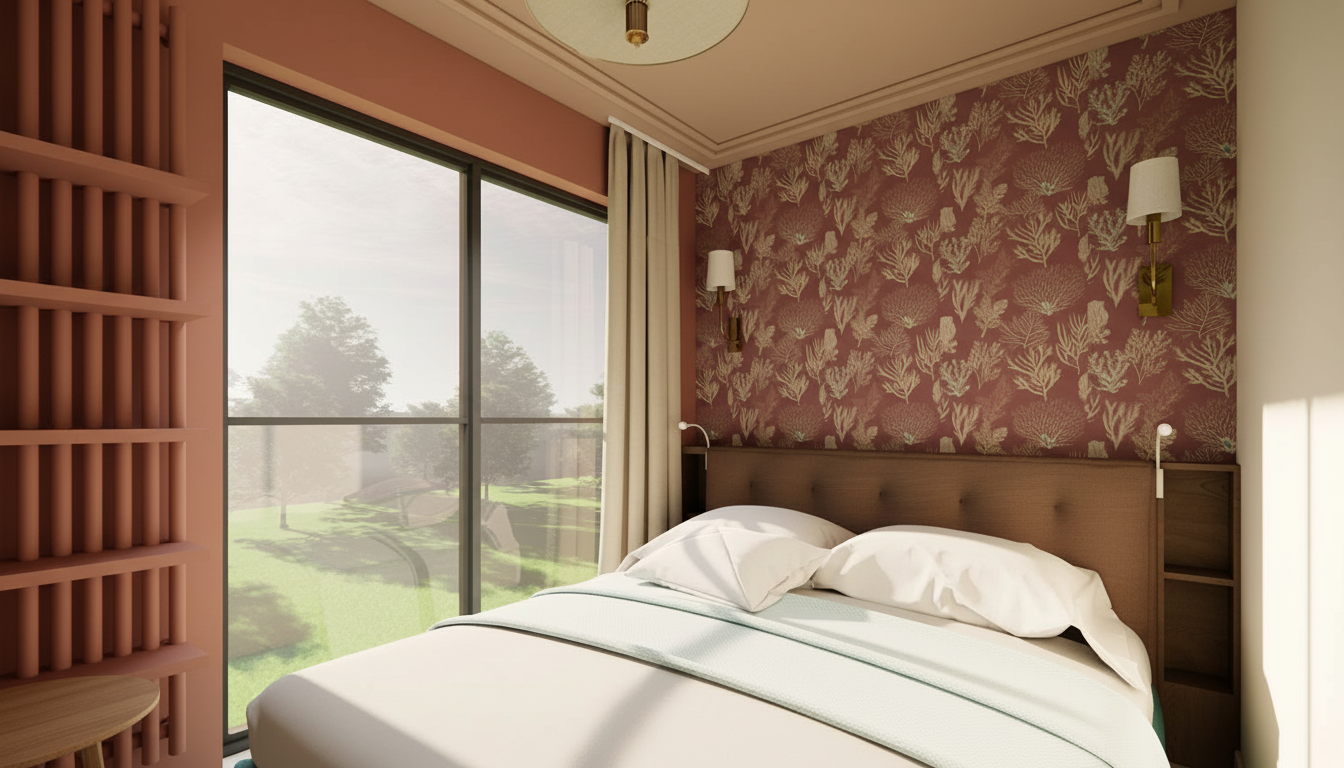colonial revival interior shot modern minimalist living room with a built in wall unit and shelving and a small round wooden coffee table remove the sofa completely and leave the space clean and uncluttered do not change the layout of the interior or the camera perspective keep the exact same composition proportions and viewpoint change the dominant wall and cabinetry color to a warm rusty brown rich earthy terracotta rust tone extend this same color to the wall in the bedroom area where the bed is visible so that it matches the living room and creates a cohesive unified space adjust the ceiling color to a complementary warm neutral tone that harmonizes with the rusty brown e g soft warm beige or off white change the bed frame color to a coordinated tone within the same palette but clearly different from the walls e g deeper brown muted taupe or dark wood tone not the same rusty color keep the area near the window empty no side table or tall cabinet keep the wall mounted shelves exactly the same height as in the reference photo on the wall behind the bed add a subtle wallpaper or accent in a deep burgundy tone that complements the rusty brown maintain a minimal aesthetic with very few decorations and clutter keep soft natural lighting neutral curtains and wooden flooring preserve the original materials ensure all reflections if any remain are fully consistent with the room subtle realistic textures high end interior design style clean and calm atmosphere architecture