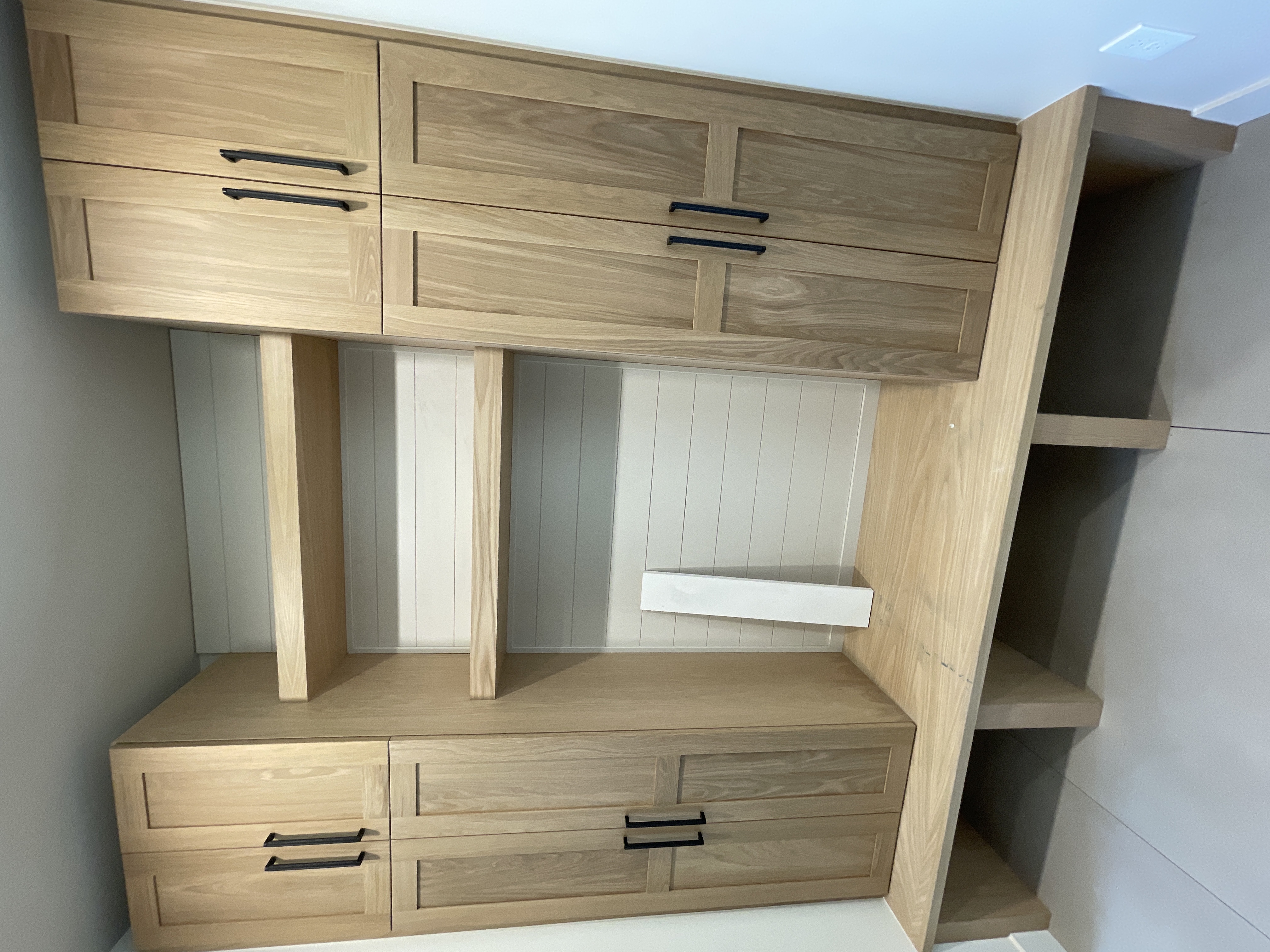 do not change the cabinets in any way preserve the exact cabinet colors materials finishes dimensions door and drawer styles hardware spacing alignment and all geometry exactly as shown do not alter the countertop shape backsplash appliances flooring lighting fixtures or wall structure only remove the construction materials clutter and mess from the scene clean the room and make it look finished and staged add a few simple tasteful home accessories appropriate for the style of the space but do not add or remove any furniture windows or architectural elements maintain the original lighting direction and realism enhance clarity and polish the photo while keeping the cabinetry and room design completely unchanged do not alter the lighting to keep the cabinet colors as they are in the image add crown molding to match on the top of the tower cabinets stage for a mudroom