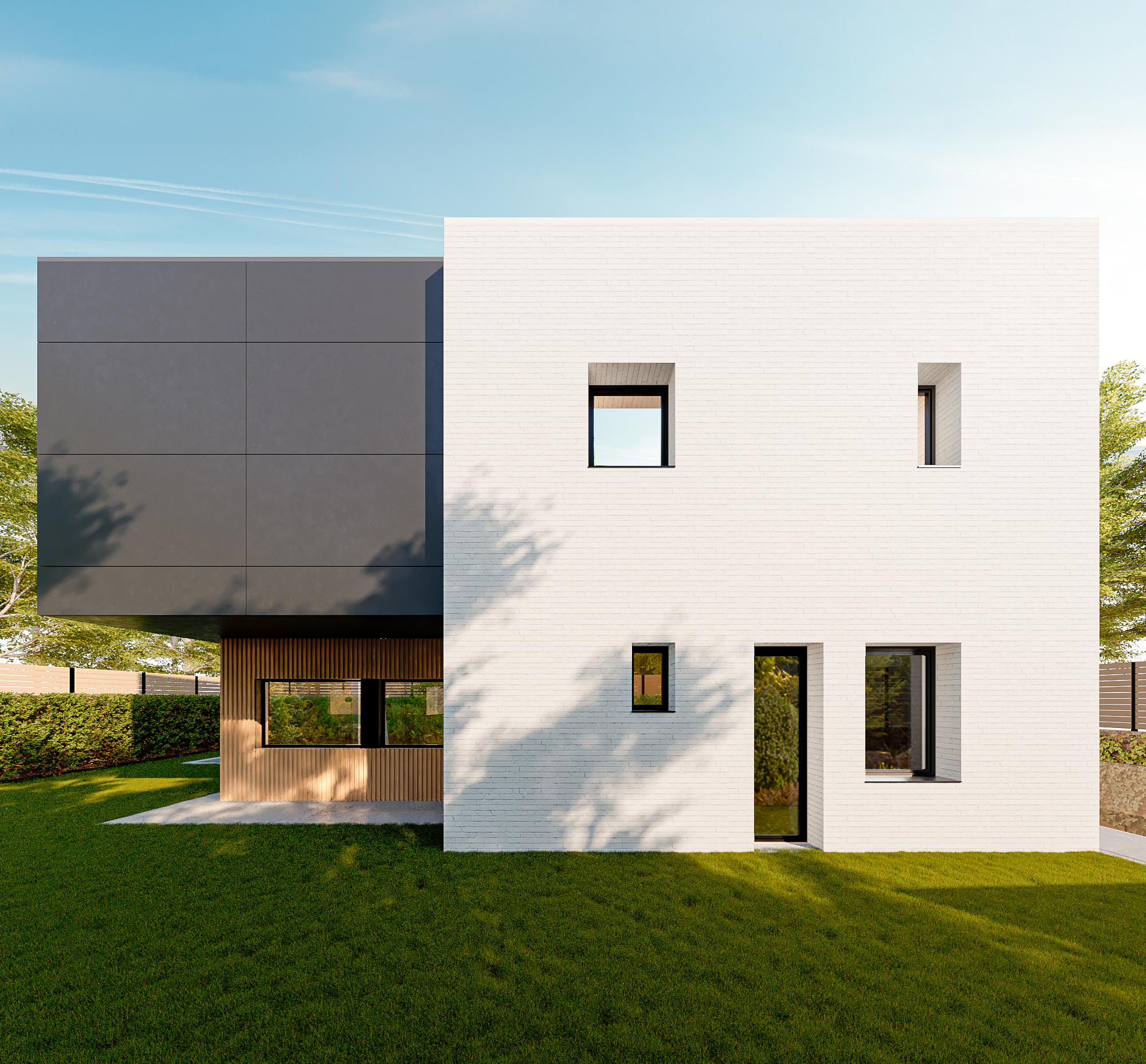 change the white brick of the piece of facade on the right side to a gray brick concrete color and change the left side of the facade dark to white do not touch the wood or anything else