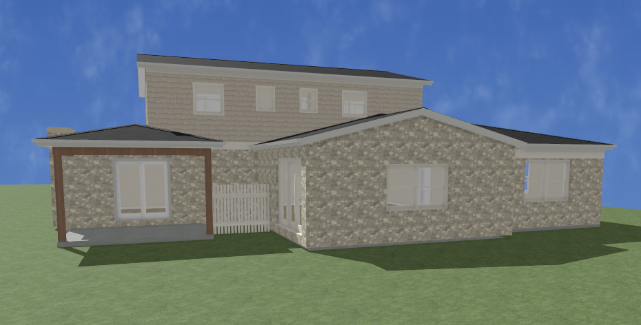 place in a suburban neighborhood add concrete steps from triple patio door warm wash the brick on the first floor and use a cream shake siding on the second level