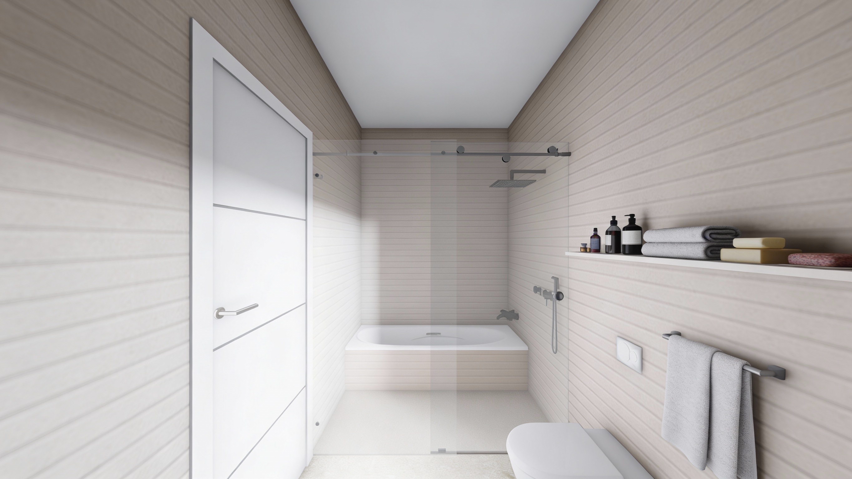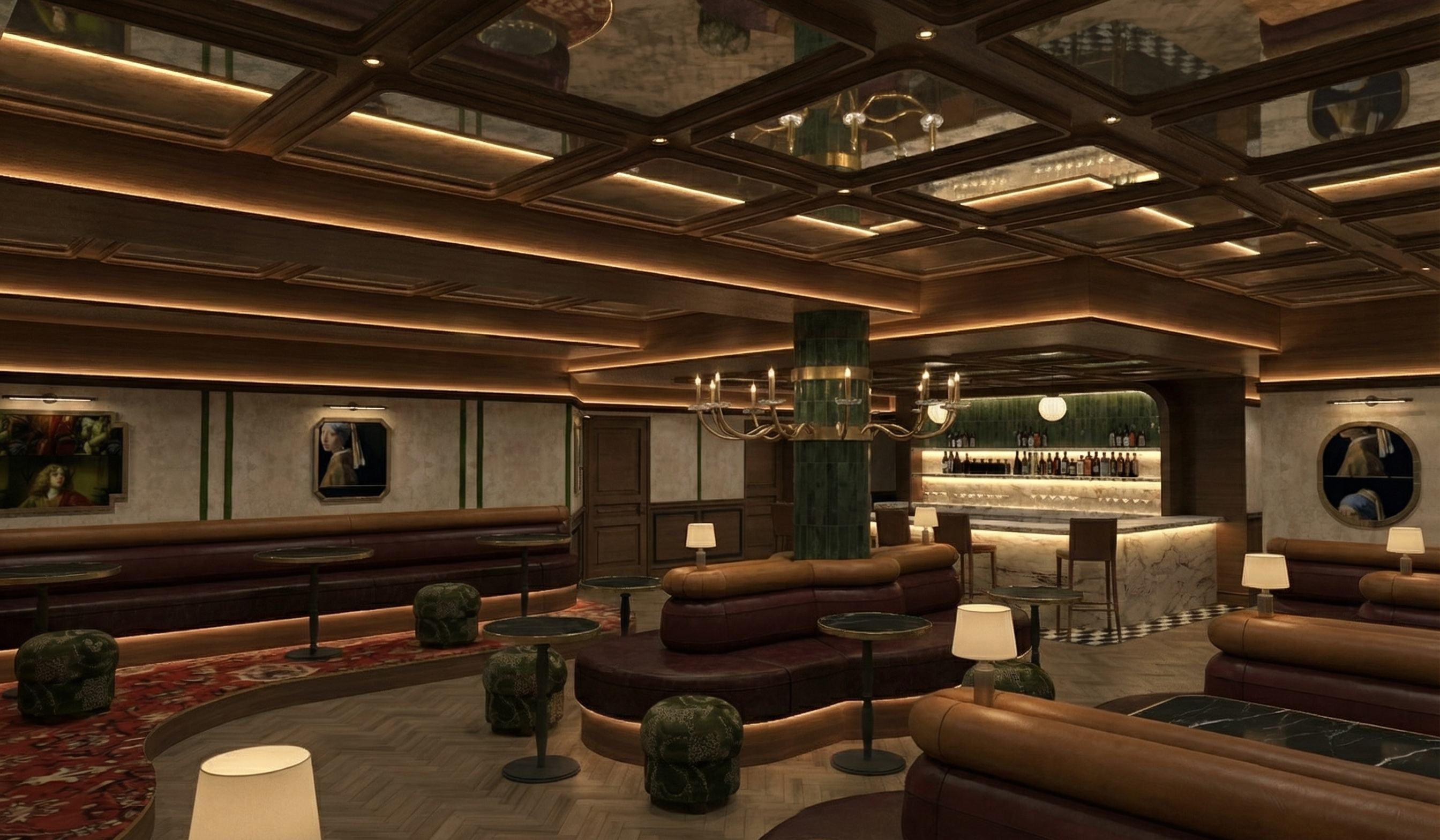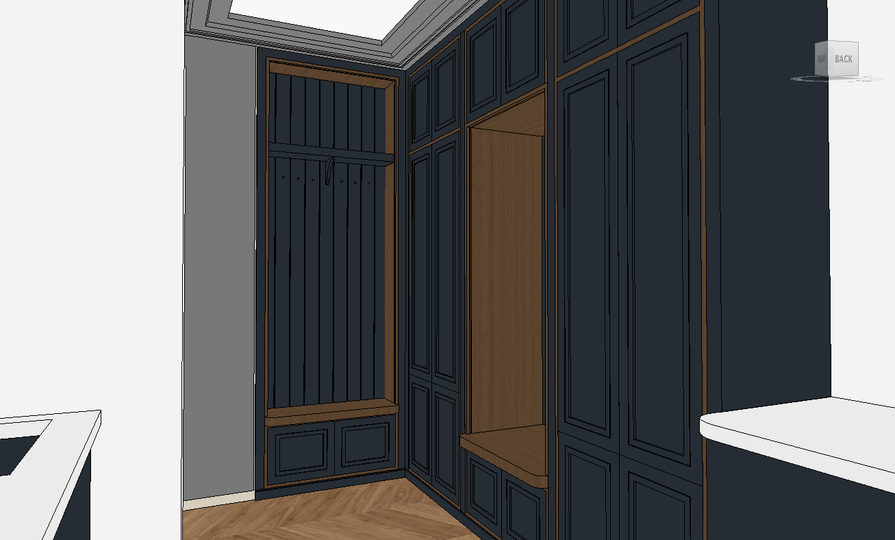 transform the provided boot room image into a high end photorealistic render that matches the same overall design language material palette and lighting approach as the adjoining kitchen and living spaces keep the design exactly the same with no changes to geometry proportions or object positions all cabinetry layouts panel divisions bench dimensions wall alignments ceiling form and floor pattern must remain unchanged with nothing moved added removed or resized the ceiling must retain its recessed detail with only indirect lighting concealed within the ceiling recess emitting a soft even glow that enhances depth and joinery without introducing any visible direct light sources all timber elements including bench seating and internal linings must be rendered in a rich contemporary walnut that is warm and refined but not overly dark with a matt finish clear grain definition and subtle tonal variation painted cabinetry should remain in a deep muted blue with a contemporary interpretation of traditional panelling maintaining all panel proportions door sizes and edge details exactly as modelled with timber accents retained where indicated the space should feel clean practical and lived in with realistic detailing such as subtle wear accurate material junctions and soft natural shadows while remaining uncluttered lighting materials and textures should be physically accurate and consistent with the adjacent rooms creating a cohesive calm and well crafted residential boot room