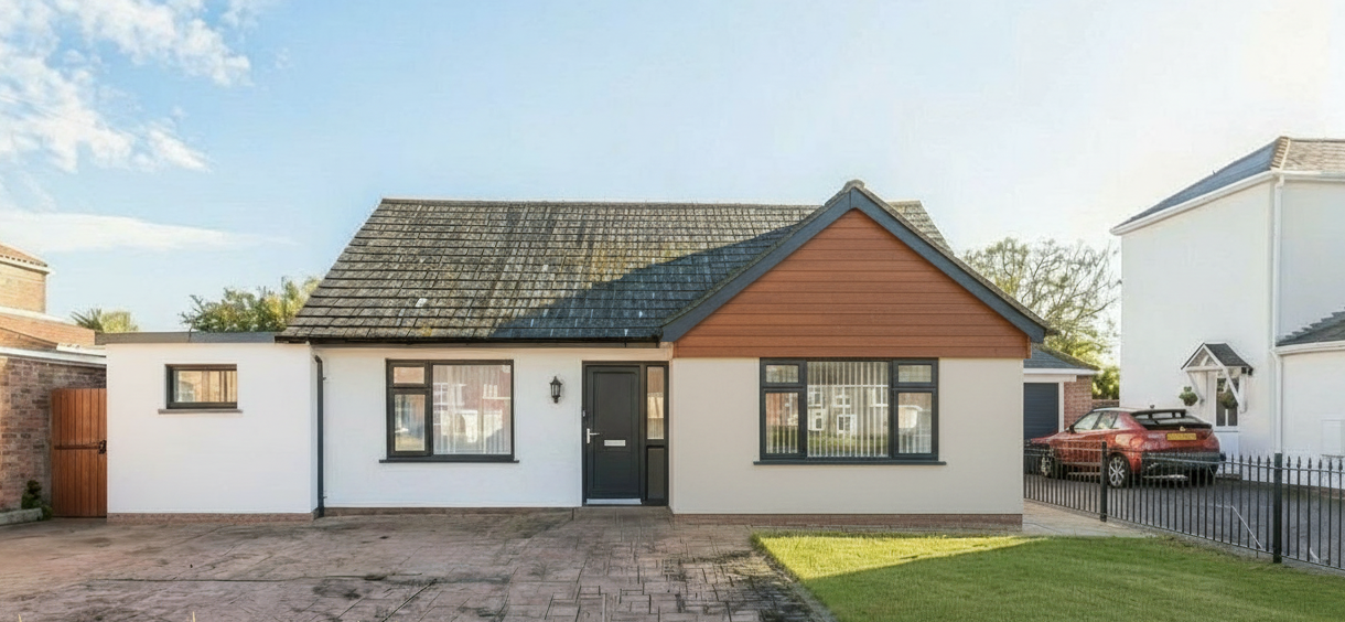 exterior shot keep the building size shape windows and doors and the landscape setting exactly the same as the source image