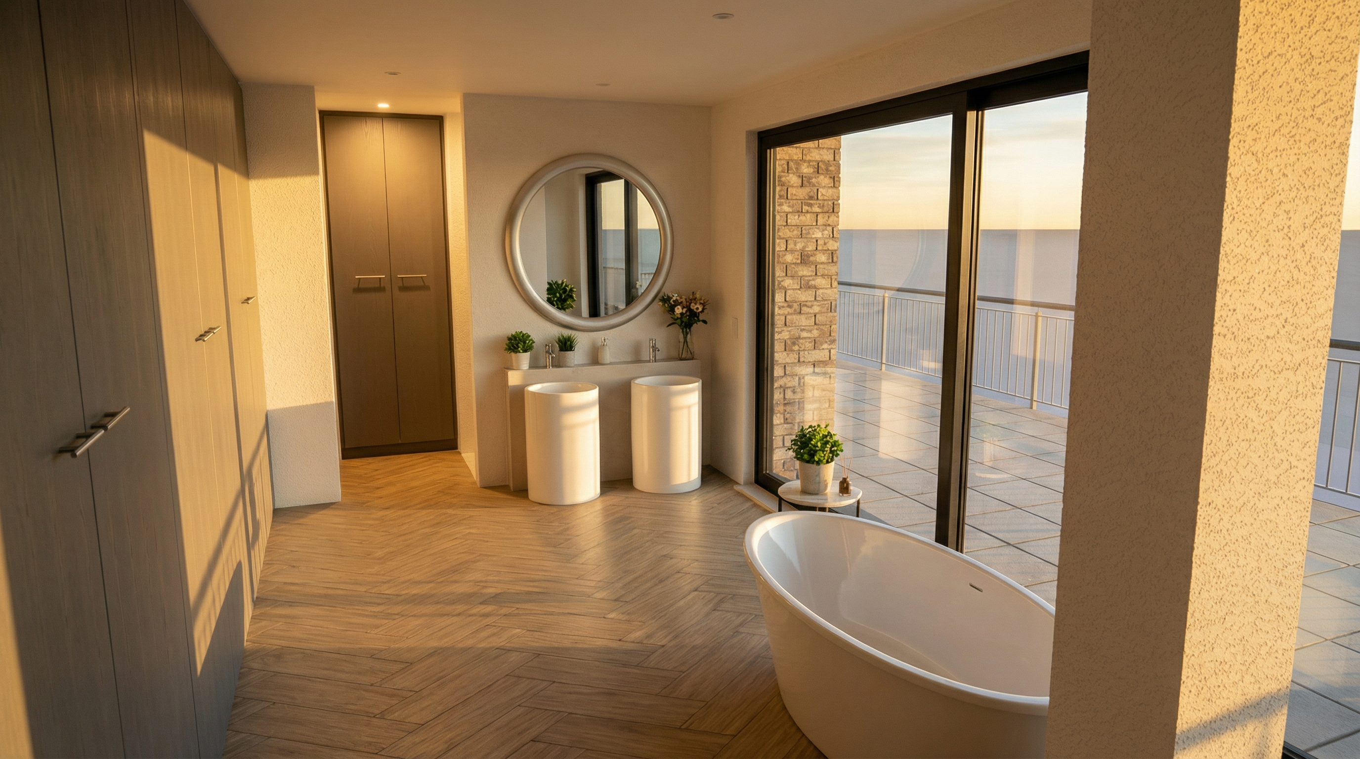 render a minimalist room with a warm inviting atmosphere use soft beige walls and a ceiling with a smooth off white finish incorporate two wooden daybed frames made of light oak featuring clean lines and a natural grain texture cover each daybed with a simple muted gray mattress illuminate the space with natural sunlight entering through a small window casting gentle shadows on the warm wooden floor add a cozy peaceful ambiance with a touch of simplicity and modern elegance