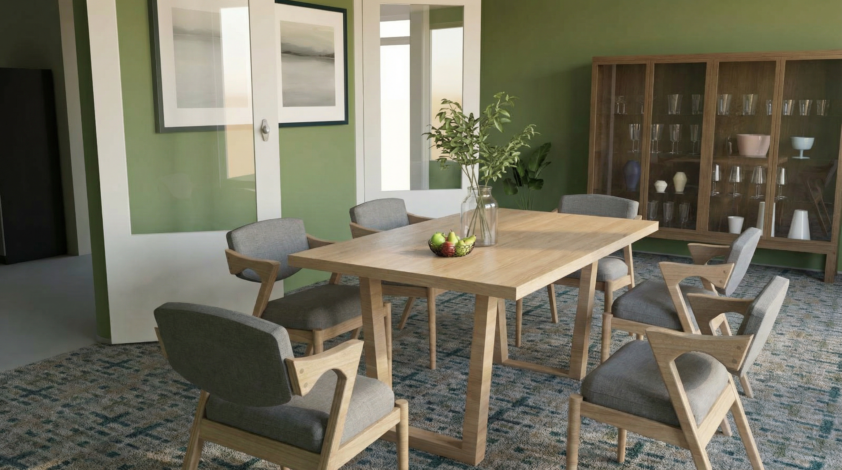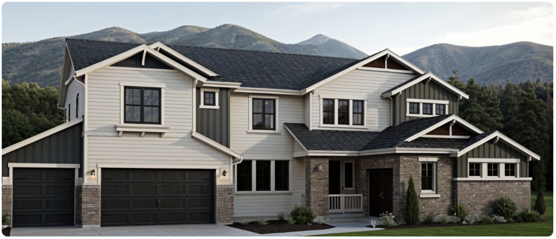make the garage doors and front door out of medium toned wood make the body of the house grey green