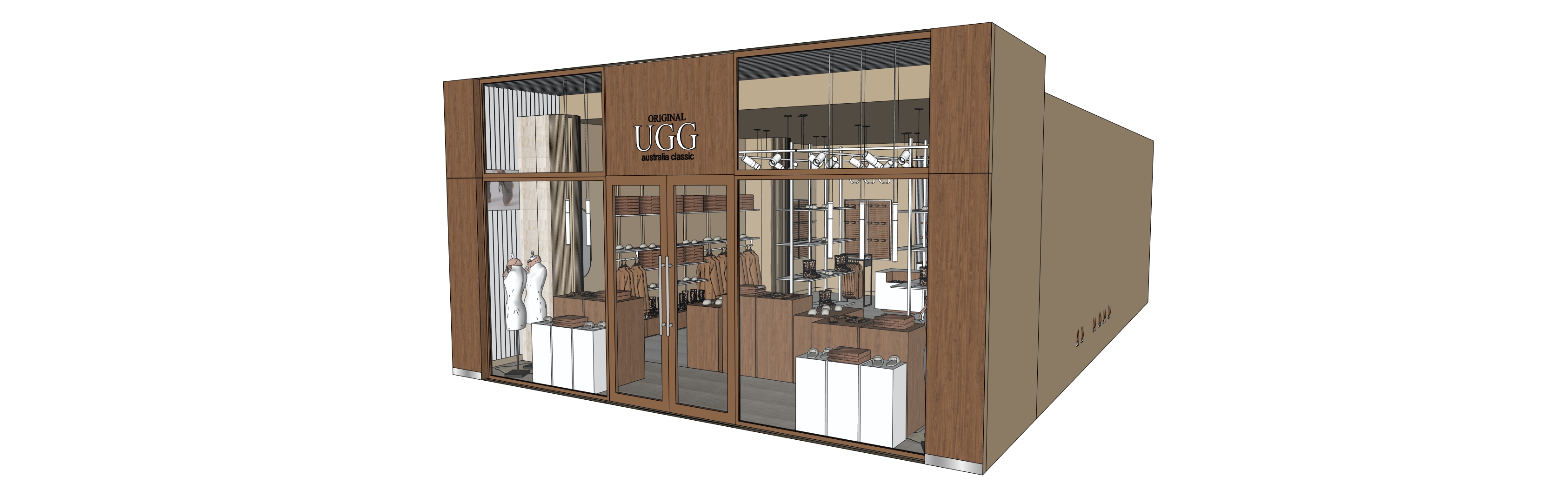 render with bright lighting and set within a shopping centre mall allow lighting to filter through the glass into the interior ensure the timbers have a soft texture illuminate the ugg in the shopfront signage