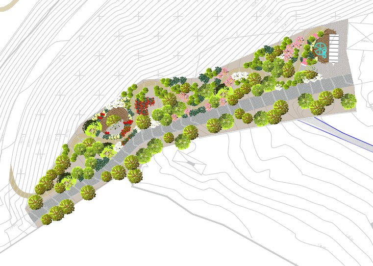 exterior shot aerial view of a landscape architecture plan on a sloping terrain from the top a winding dirt path starts meandering through mediterranean vegetation with cork oaks pines rosemary myrtle strawberry trees gum rockrose and heather the vegetation is on bare soil next to it a road with an inert grid pavement at the top at the beginning of the path a mobile home with a semi circular wooden front deck halfway along the route another wooden deck in a cozy area that invites meditation the environment is sunny and conveys calm and tranquility