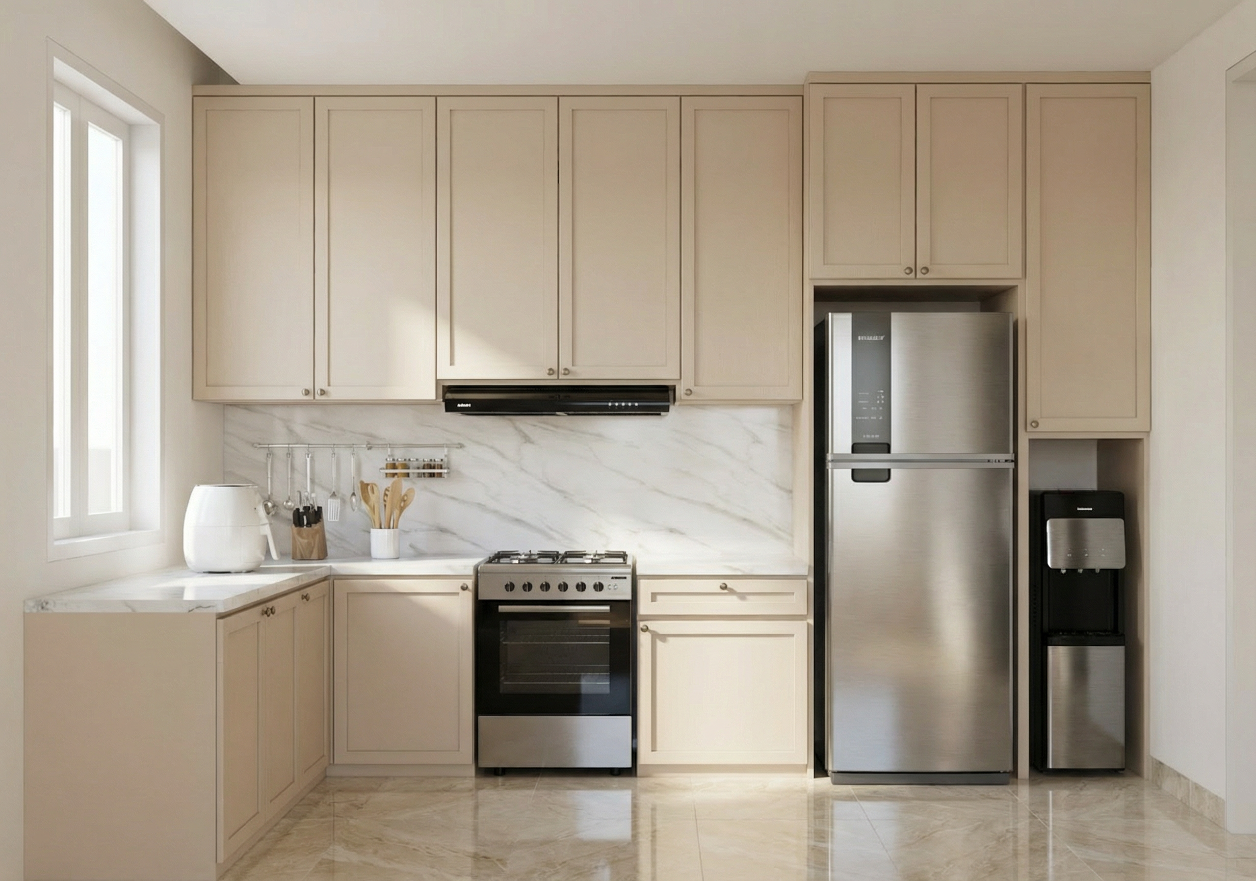 create ultra realistic images without altering any structure shape design or materials do not resize the jpeg use a glossy light beige marble texture for the floor white marble stone for the countertop and backsplash off white walls and plain beige kitchen cabinets do not alter the color material or shape black glossy cookerhood no handle in cabinet