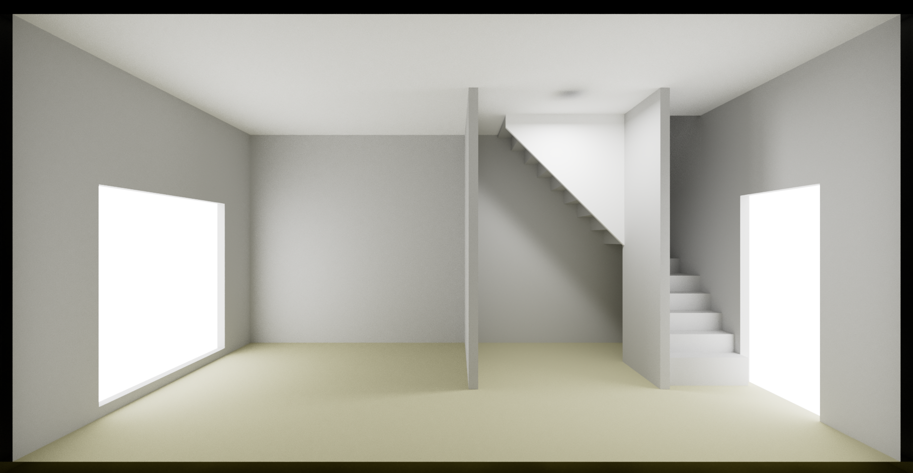 high tech interior shot near window kitchen on middle bathroom near stairs enter door loft style ouside is first floor grass with trees then fence and road architecture