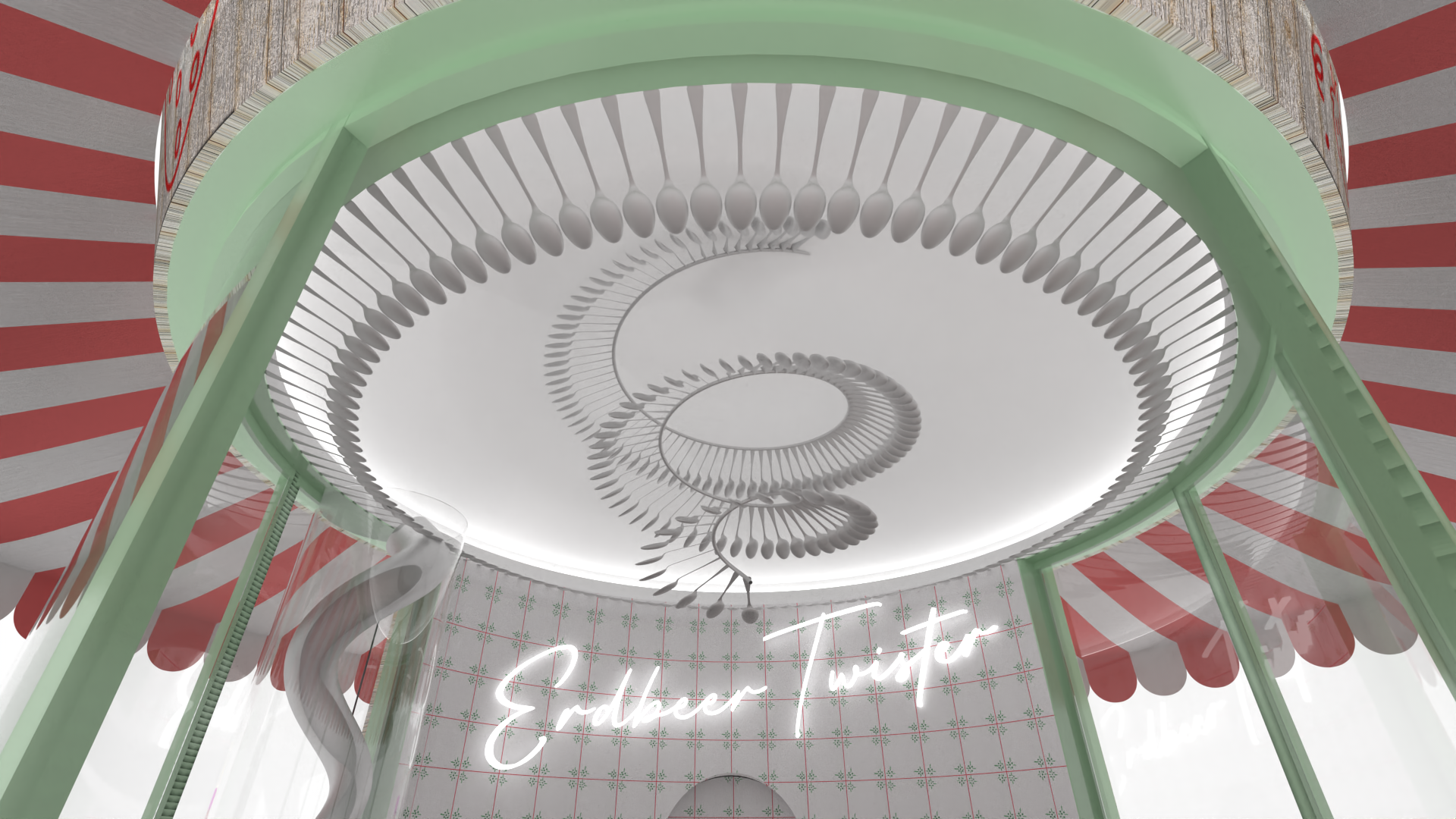 spoons are arranged in a sculptures way to act as stucco a spiral of spoons serves as a chandelier