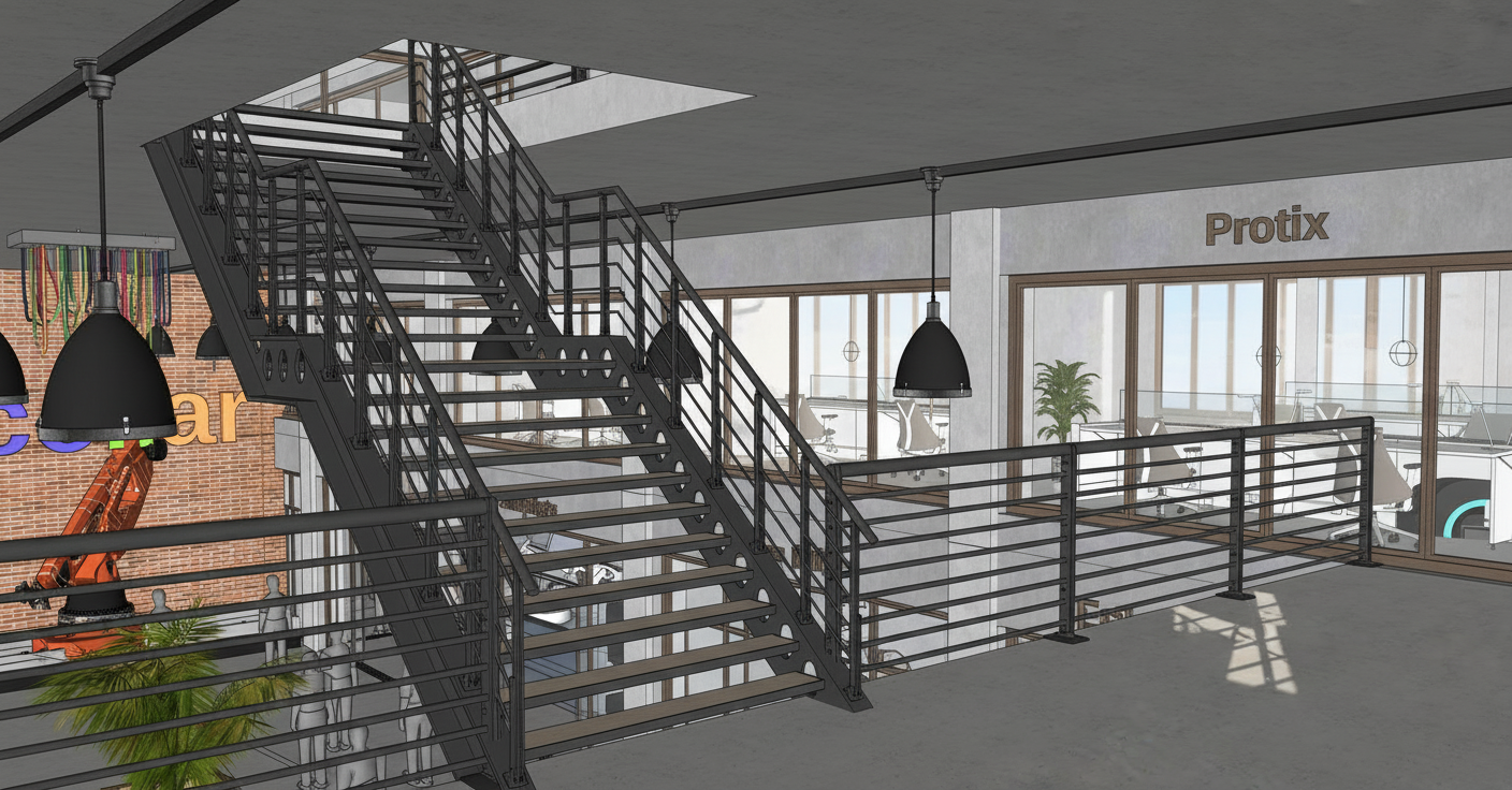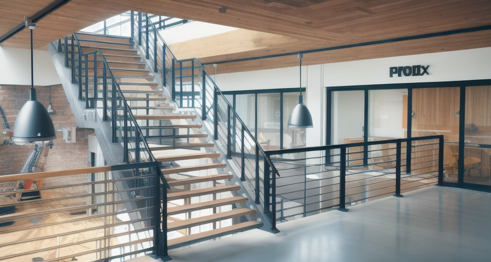 modernist interior shot industrial coworking space wooden details white walls concrete floor light ambience architecture