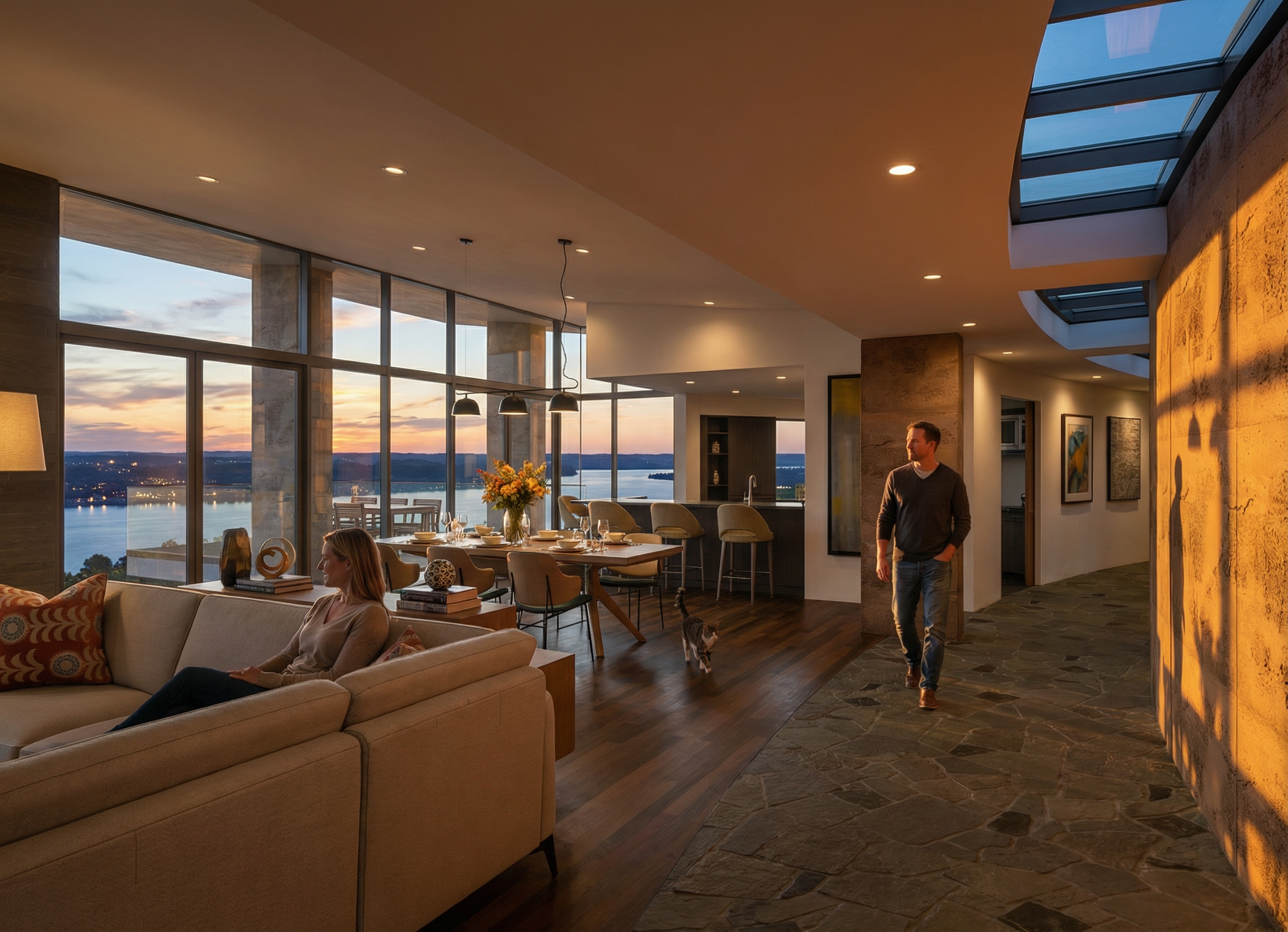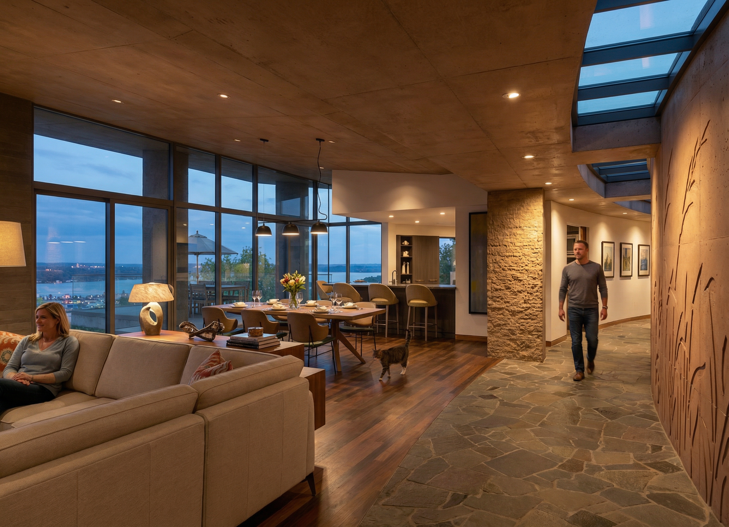 night view with some small lights from boats on the lake add some lights in the far distance coming from houses make the view out of the windows of lake pepin from a high elevation use site cast concrete for the main house material with a natural warm clay color add some abstracted prairie grass patterns in bas relief with a natural warm clay color to the curved site cast concrete wall on the right side of the view cast light on the curved wall at the right side of the view from the recessed lights add table settings and flowers in a vase to the dining room table add a man walking along the curved corridor towards the camera add a man an a woman sitting on the sofa add some accessories on the credenza add light coming from the pendant lights over the dining table add three framed black and white photos on the left wall of the corridor add a cat walking through the dining room use the materials in the original view for reference in this rendering hit the painting on the wall to the right side of the bar stool with light add a woman sanding in the kitchen add some hors d oeuvres and a bottle of wine on the kitchen bar counter