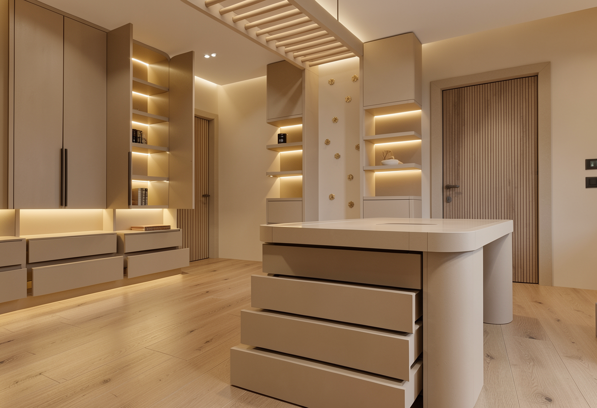 beige interior design with small oak wood elements subtle led lighting horizontal oak wooden flooring beige table