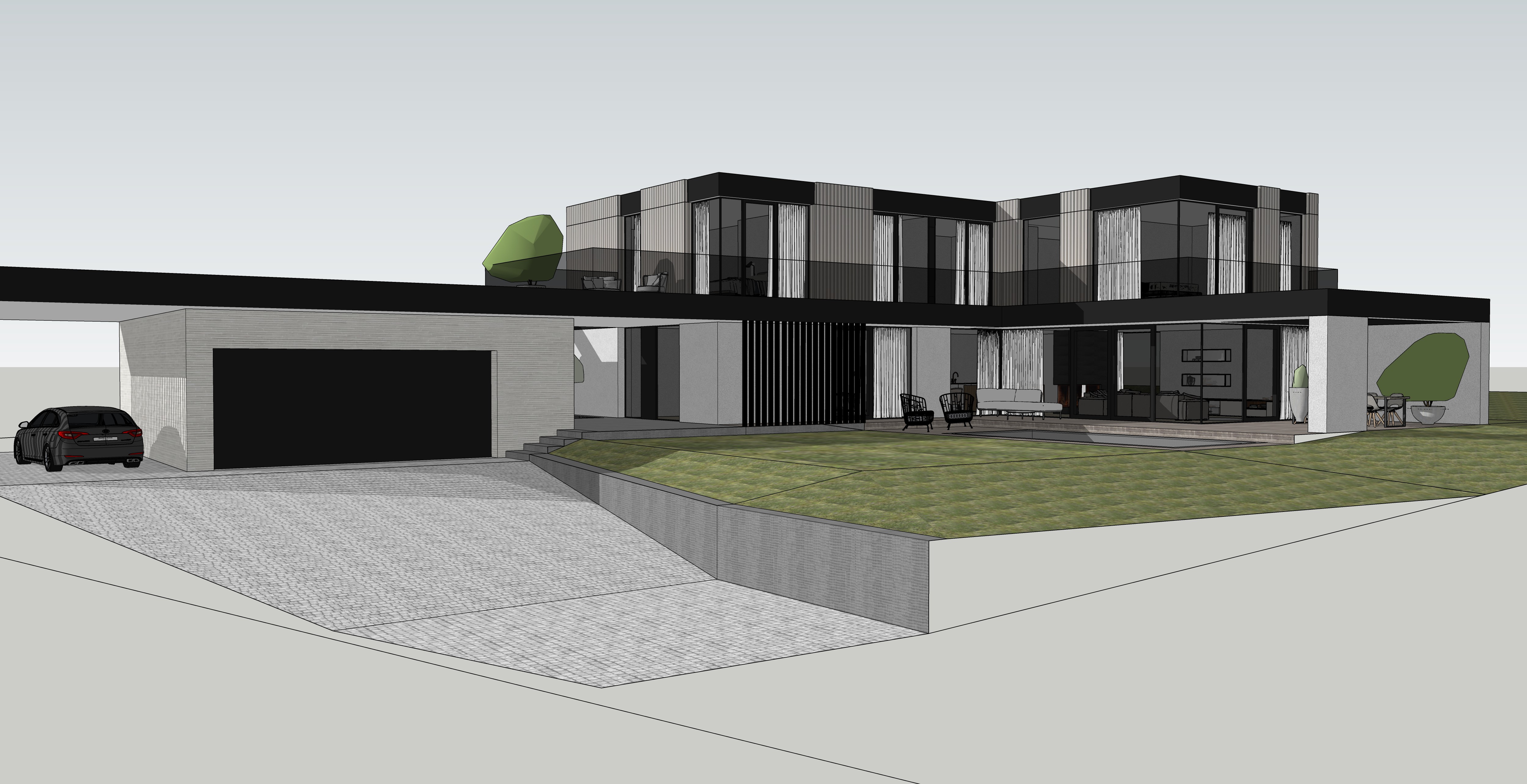 precise photorealistic visualization of the exterior of a residential house glass railings garden grass and trees winter gray clouds black parts sheet metal windows glass
