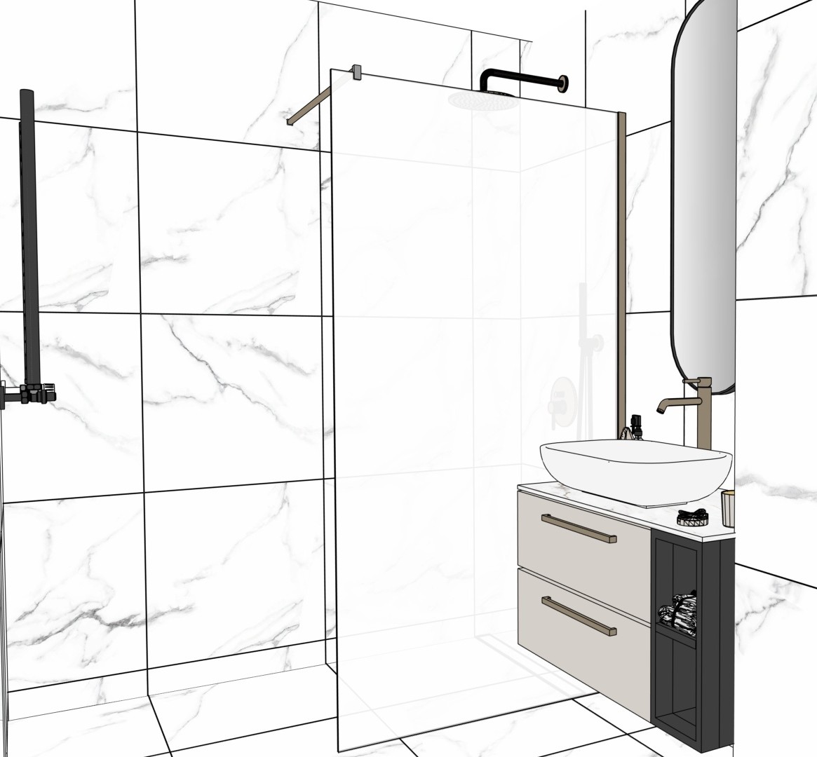 fotorealistyczna fotografia wn trza klasy premium projekt uk ad meble i materia y bez adnych zmian wzgl dem obrazu wej ciowego naturalne wiat o dzienne perfekcyjna ekspozycja naturalny balans bieli bardzo realistyczne materia y i detali zero zmian zero okien p ytki w ca ej azience wygl daj jak marmur z delikatn szar y k prysznic i bateria prysznicowa i umywalkowa jest w kolorze szczotkowany nikiel zlew i wc jest w kolorze bia ym obok lustra wisz dwie czarne w skie lampy lustro z czarn ramk z o wietleniem led za lustrem szafka umywalkowa jest w delikanej szaro ci z czarnymi otwartymi p kami po lewej stronie jest czarny grzejnik zawie na nim dekoracyjny r cznik dope niaj cy przestrze
