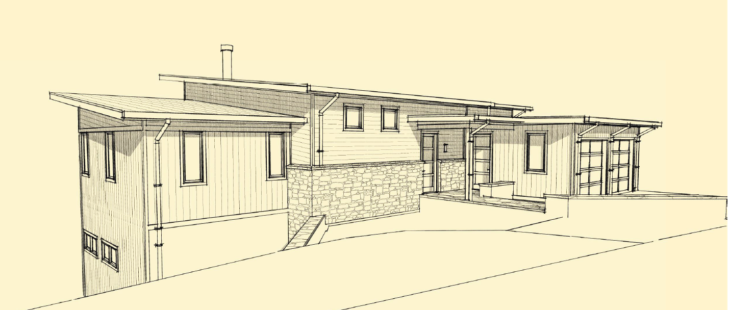 exterior shot render this modern moutain home using the exact architecture and a three part color scheme the roof is dark bronze standing seam