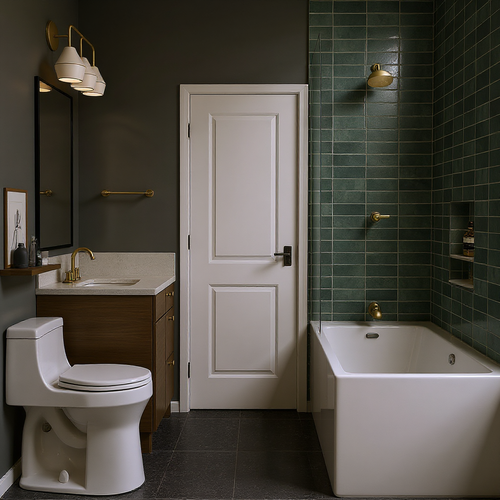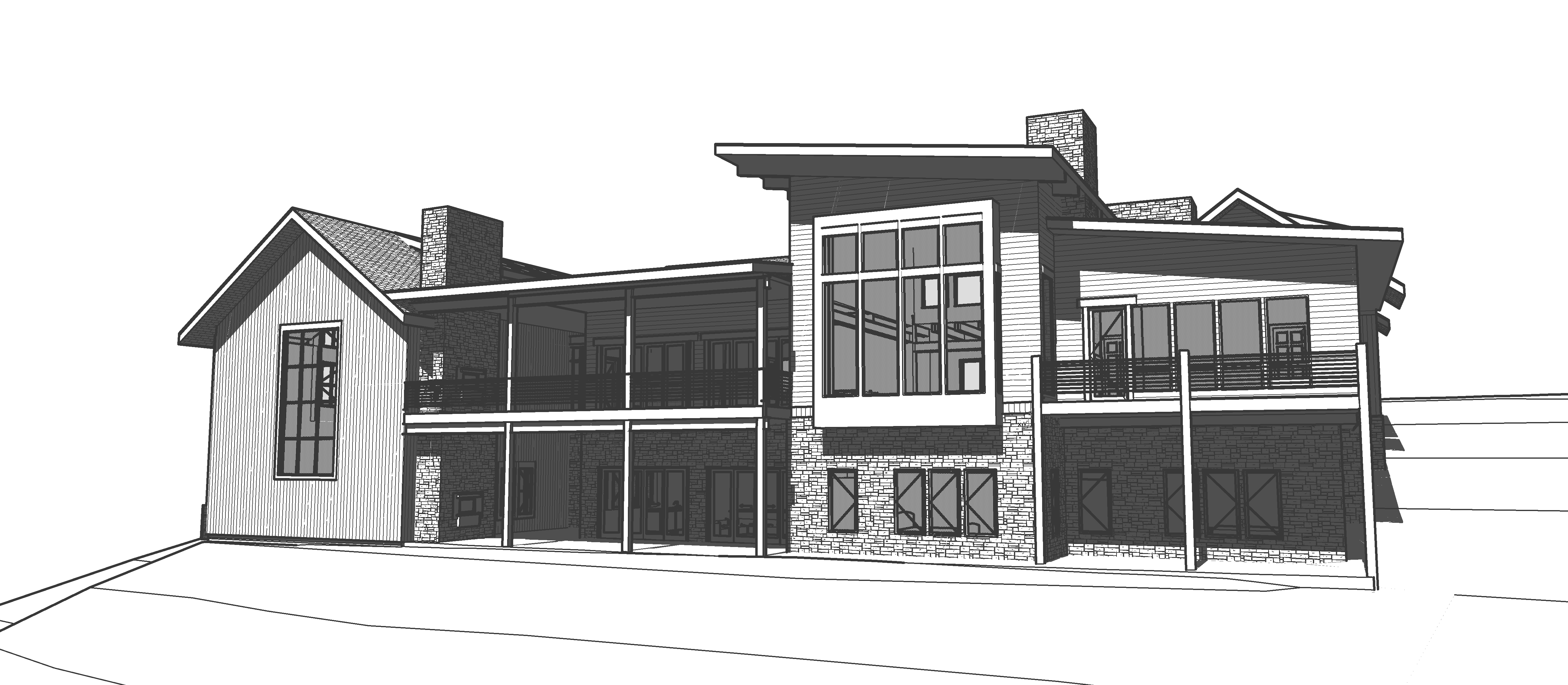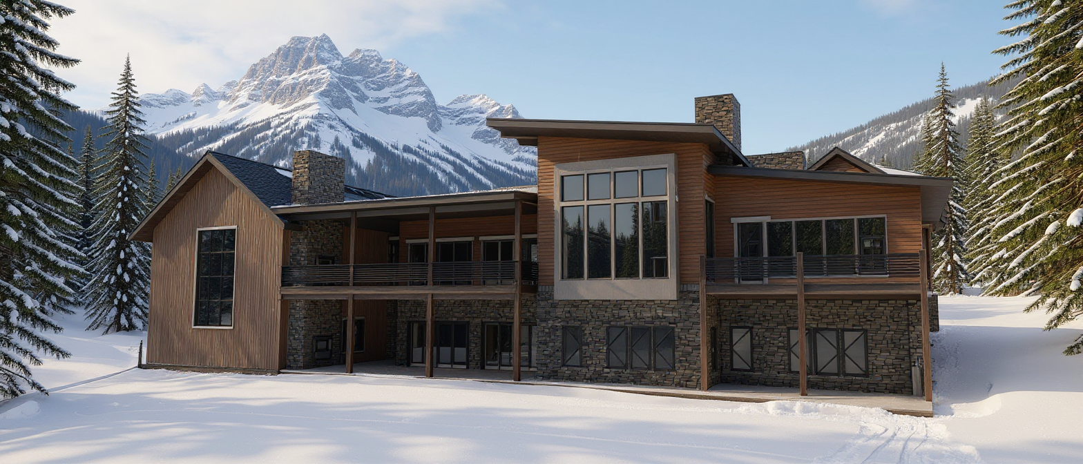 mountain modern ski home with dark window frames and grey siding in snowy pine forest with mountains in the background just before sunset