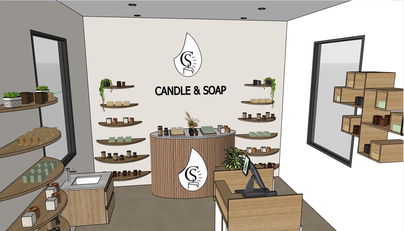 create a photorealistic render of this pop up kiosk candle and soap kiosk the view outside the windows is a shopping mall maintain the same layout shelving products and furnishings turn on the wall logo and the logo on the central display with a soft warm glow