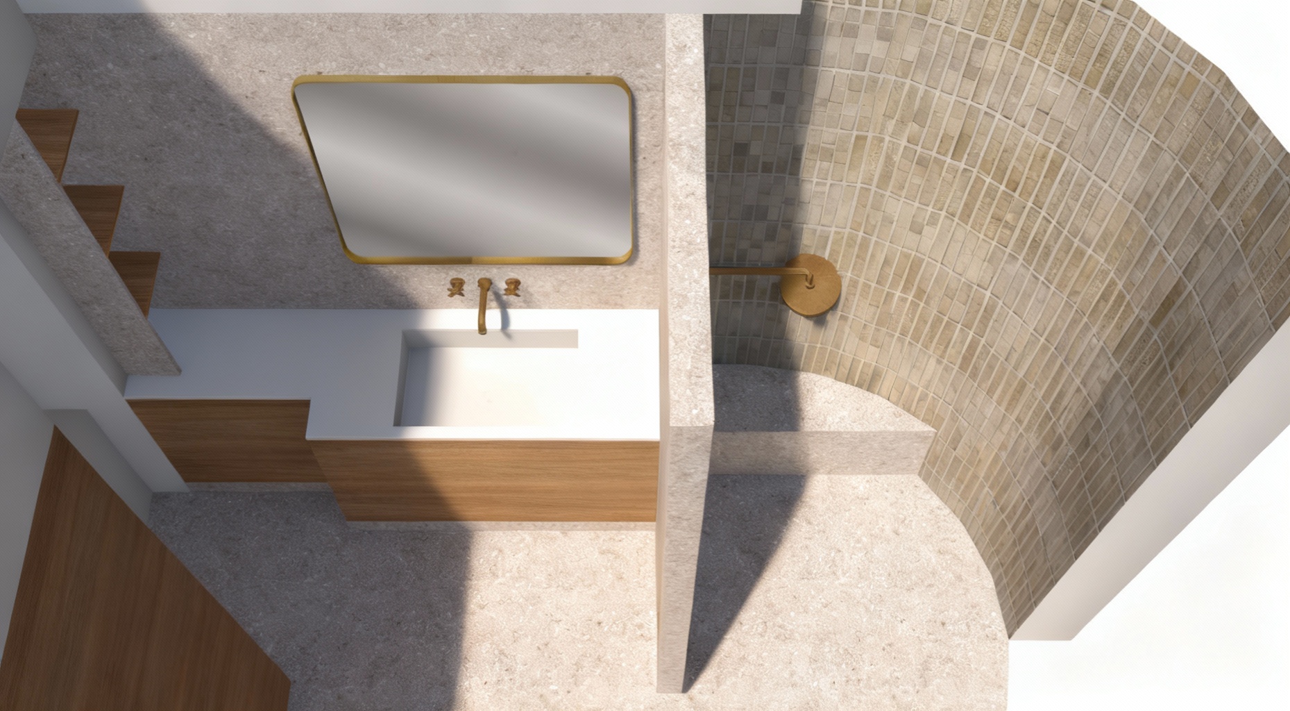 enhance this model with high realism while strictly preserving the original camera angle perspective proportions layout geometry and spatial relationships of the model keep all objects in their exact positions and maintain the same scale and composition improve materials lighting shadows textures and environmental details to achieve a photorealistic architectural visualization add subtle surface imperfections realistic reflections and natural light behavior do not change or add any new architectural elements unless they are small realism details e g material texture natural light soft shadows maintain the original design intent exactly