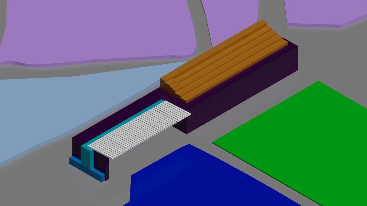 create a realistic perspective image of a heavily wooded park the view is from below the trees the treetops are not visible the gray area represents pavement the purple areas represent green grass the light blue area is a pond the green area is a futsal field the dark blue area is a children s playground and the central figure is a small open one story building with restrooms the white area represents a wooden pergola that carries water to one side and the brown area represents small wooden bleachers overlooking the soccer field