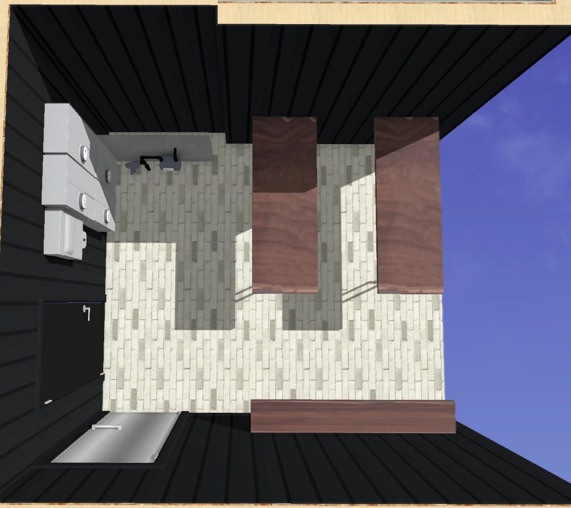 realistic overhead view looking down add basic porthole to black slab door add black angle brackets to the floating shelf door is slab siding is all black
